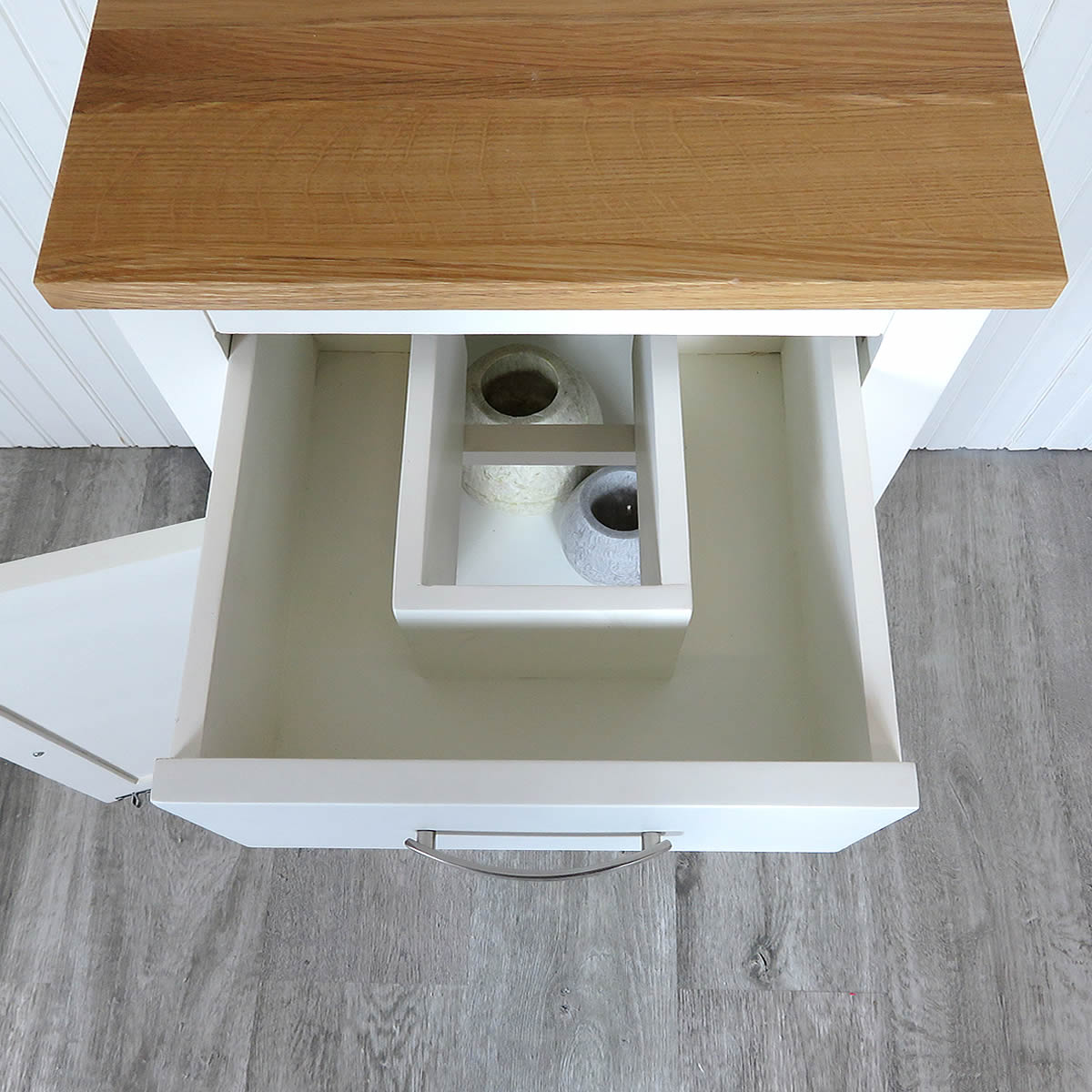Please note the top drawer to this unit has a cut out. Top mirrored cabinet is not included.