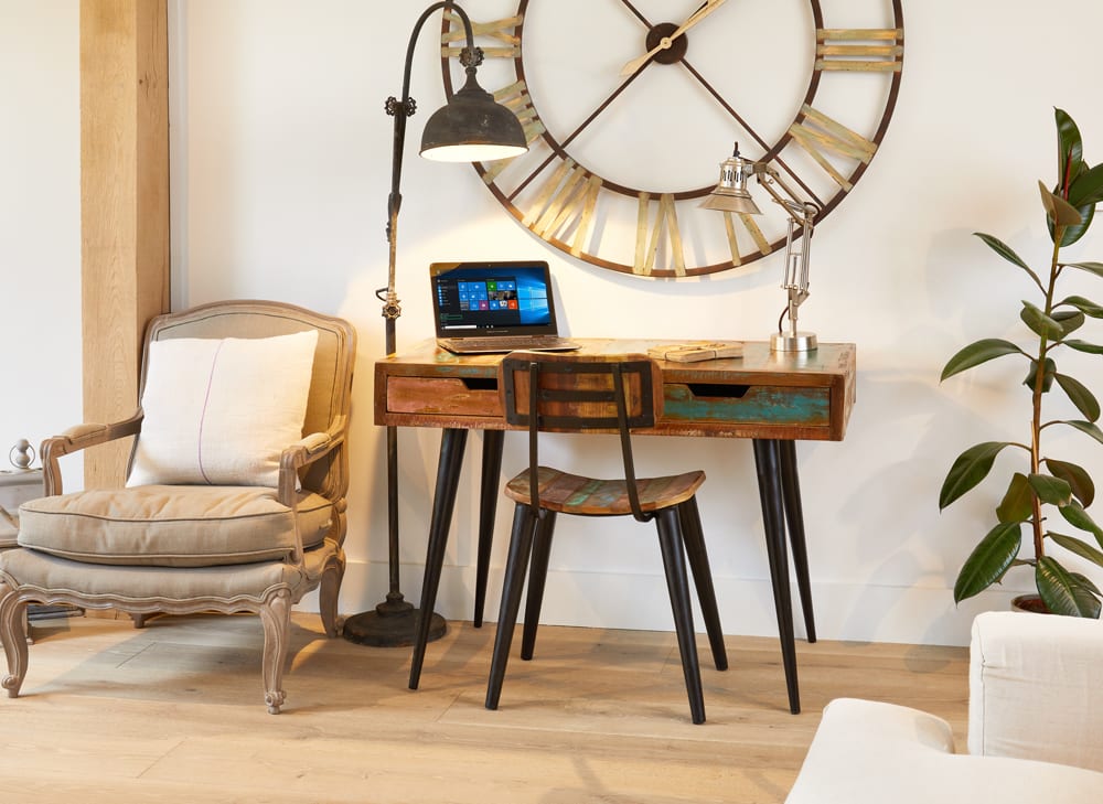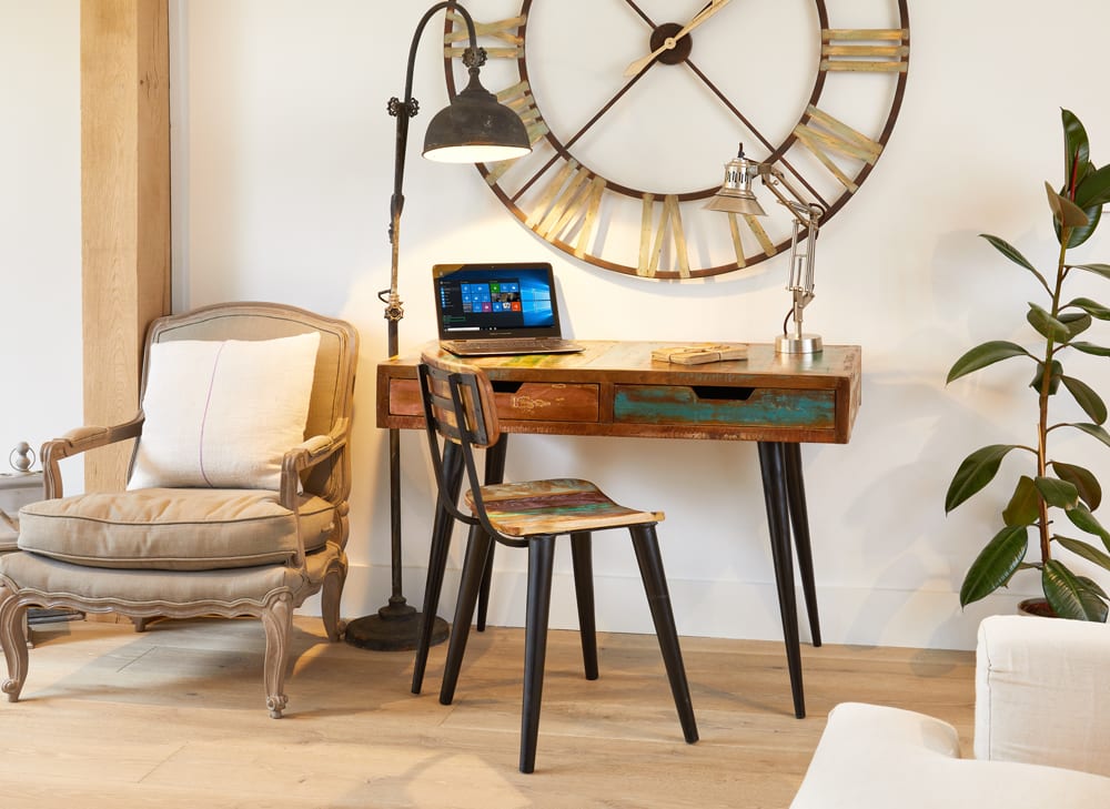 - The desk is handmade using reclaimed wood salvaged from places such as Gujarat, Maharashtra and Rajasthan Southern India making it environmentally friendly and also a truly one of a kind piece of home furniture.