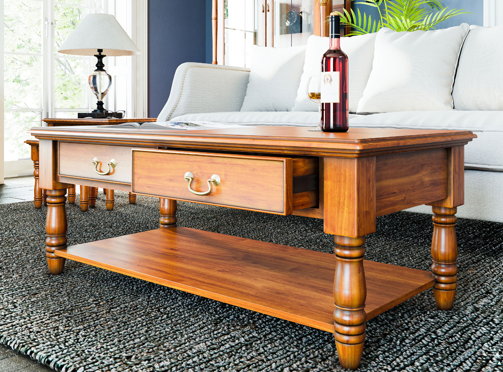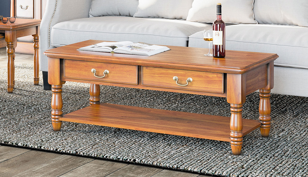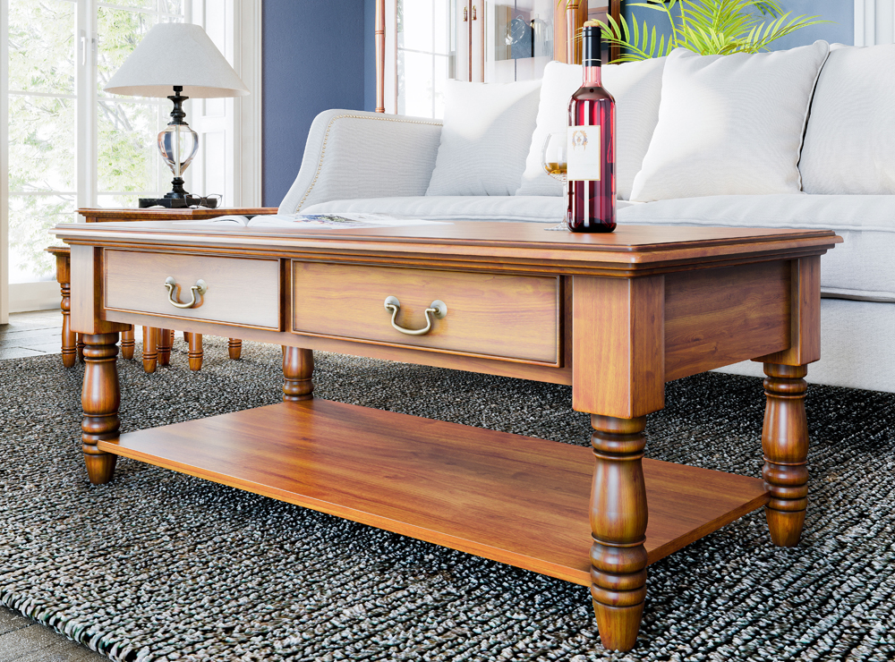 - La Reine, Tea Brown, Light Brown antique distressed mahogany coffee table with drawers. Stylish solutions for traditional living.