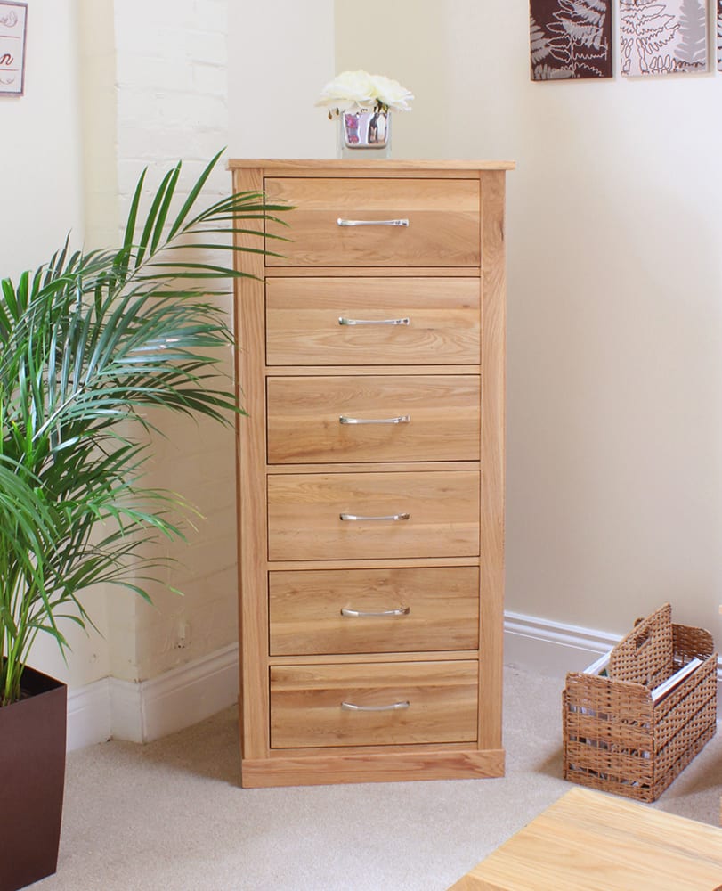 Elevate your living space with the Mobel Oak Tallboy, a brand new contemporary solid oak piece from Bathrooms & More Store in the UK. Offering free delivery and 14 day returns, this tallboy is the perfect feature piece for any room in your home. Crafted from the highest grade selected solid oak, this tallboy boasts exceptional build quality and is designed to last a lifetime. With six solidly constructed drawers and stylish brushed steel two-tone handles, this piece is not only functional but also a beautiful addition to your home. Experience the timeless elegance of the Mobel Oak Tallboy today.