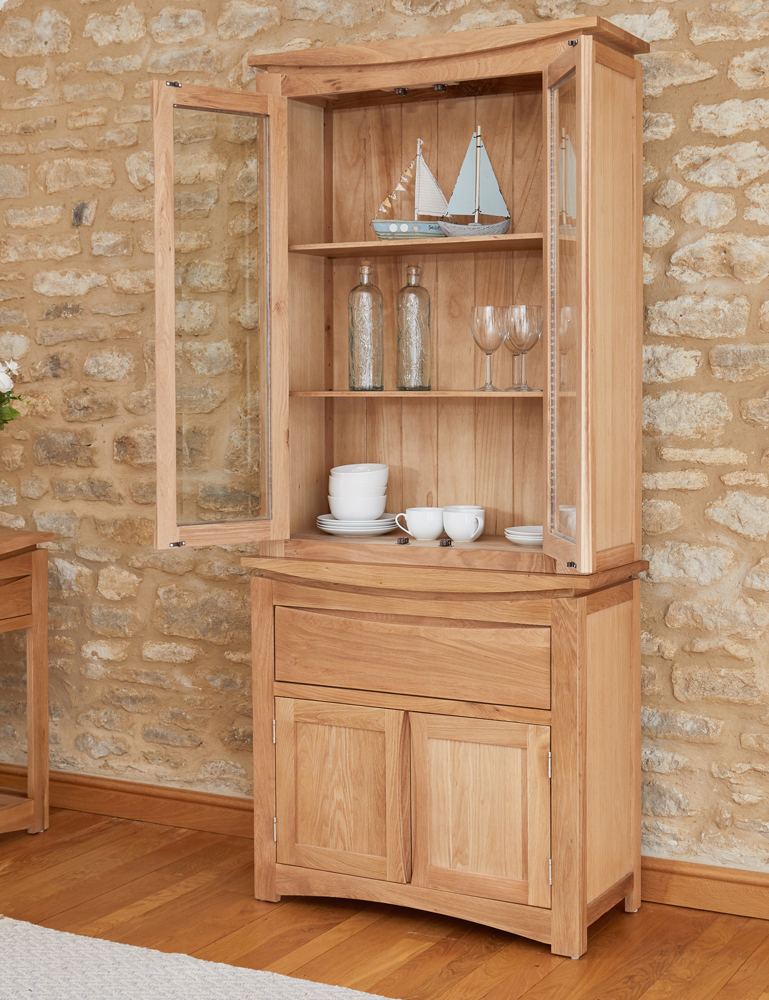 A stunning and contemporary large solid oak glazed display cabinet crafted from solid oak and with a lovely, eye-catching design, the Roscoe range will add timeless elegance to your home Finished in a resilient, clear satin lacquer to enhance the natural beauty of the wood while offering protection.