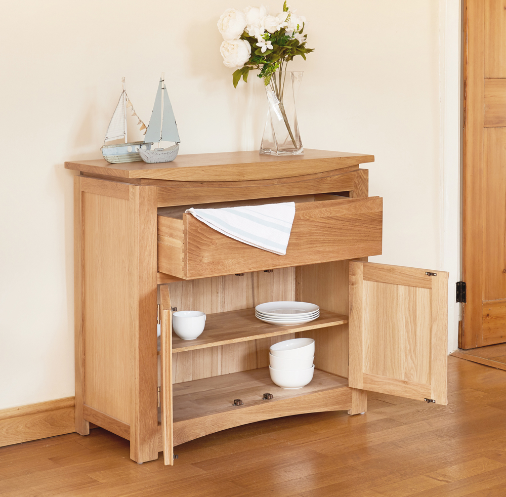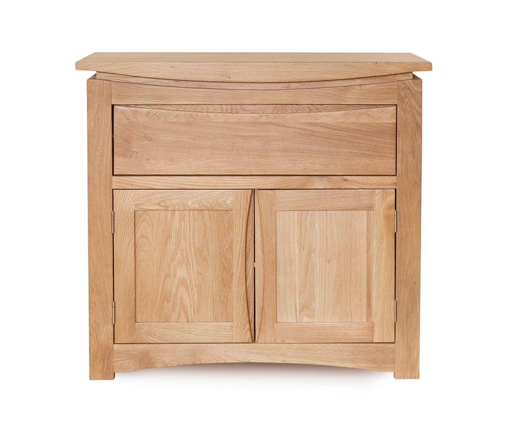A compact and contemporary solid oak small sideboard. Crafted from solid oak and with a lovely, eye-catching design, the Roscoe range will add timeless elegance to your home. Finished in a resilient, clear satin lacquer to enhance the natural beauty of the wood while offering protection.
