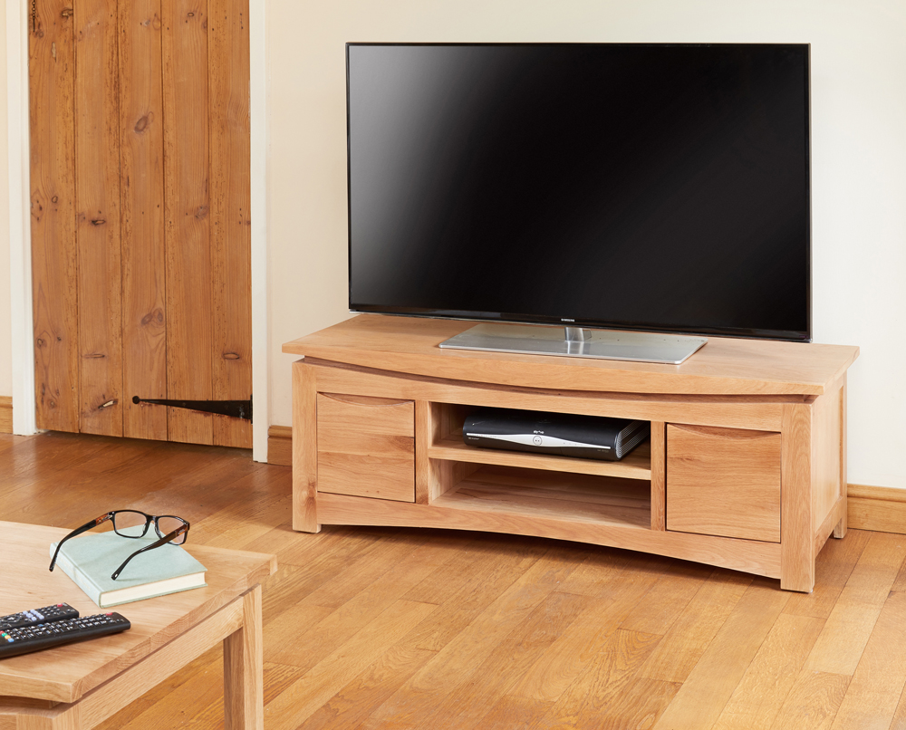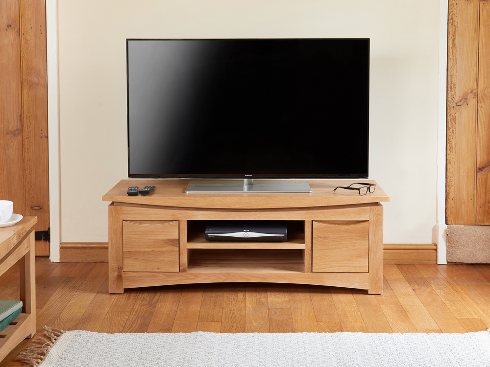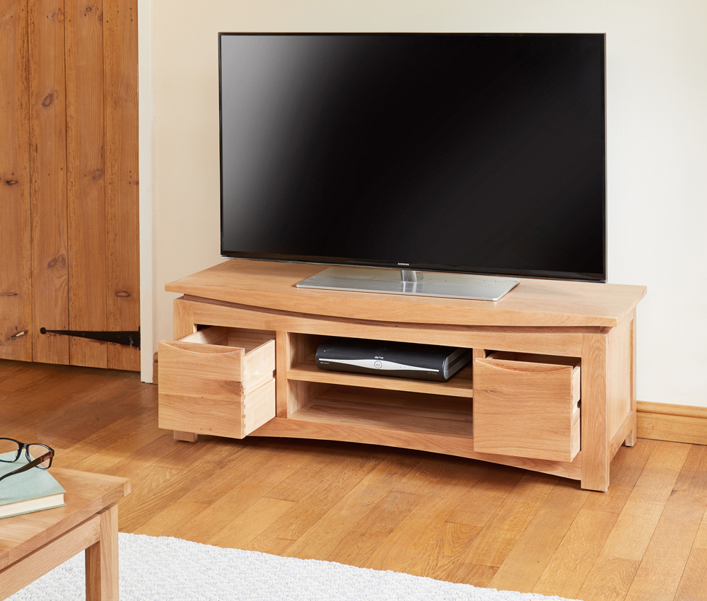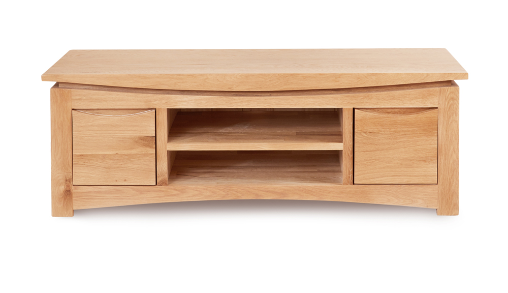 A superb solid oak widescreen television cabinet. Crafted from solid oak and with a lovely, eye-catching design, the Roscoe range will add timeless elegance to your home. Finished in a resilient, clear satin lacquer to enhance the natural beauty of the wood while offering protection. Two drawers and two shelves provide versatile storage.