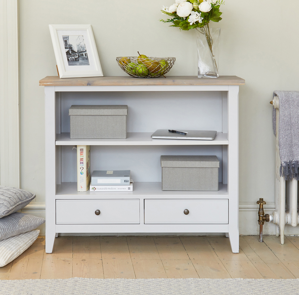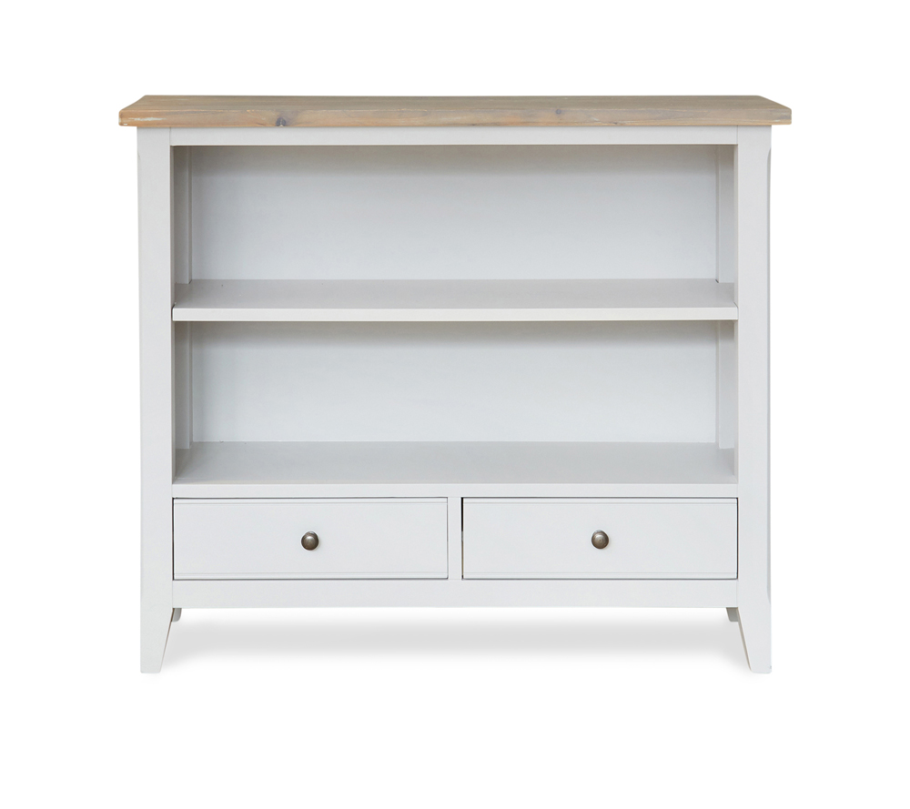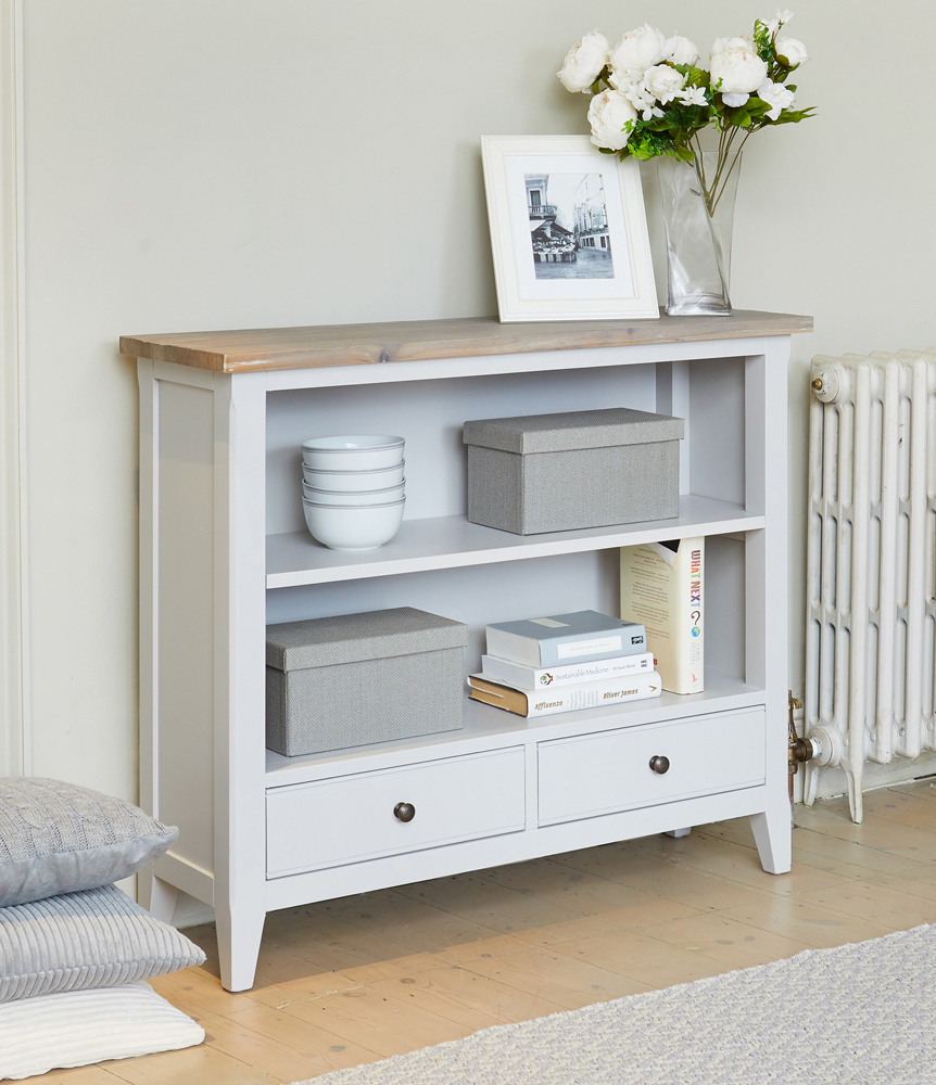 - A lovely low bookcase featuring two spacious open shelves and two drawers for hidden storage.