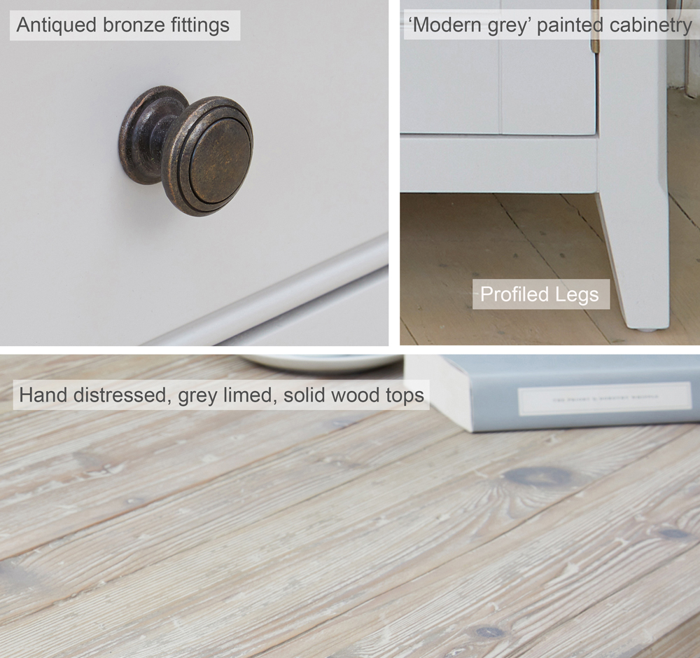 - The key feature to this collection is the exquisite hand-distressing on the grey limed tops, which is carried out by skilled craftsmen to create the unique eye-catching appearance that makes this collection so distinctive.
