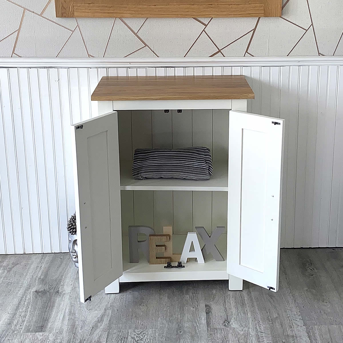 • Stunning off white/cream painted wooden base, oak topped slimline unit.