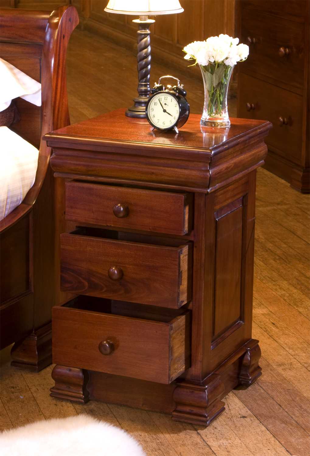 Beautifully finished with solid mahogany knobs and a paneled side detail, this stunning lamp table is a must have for any mahogany bedroom