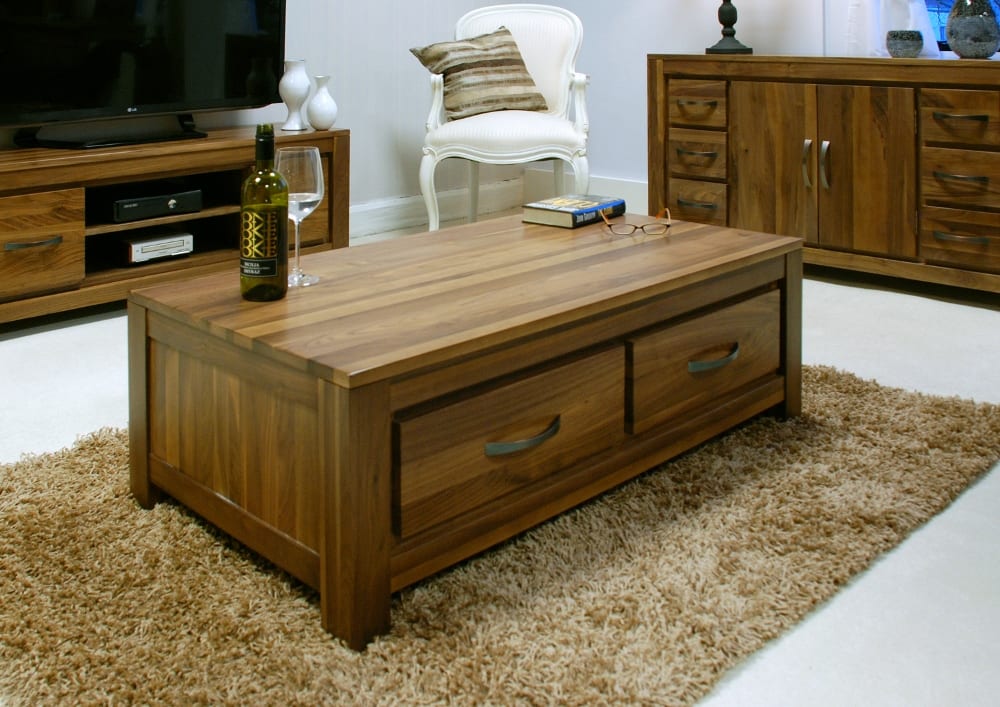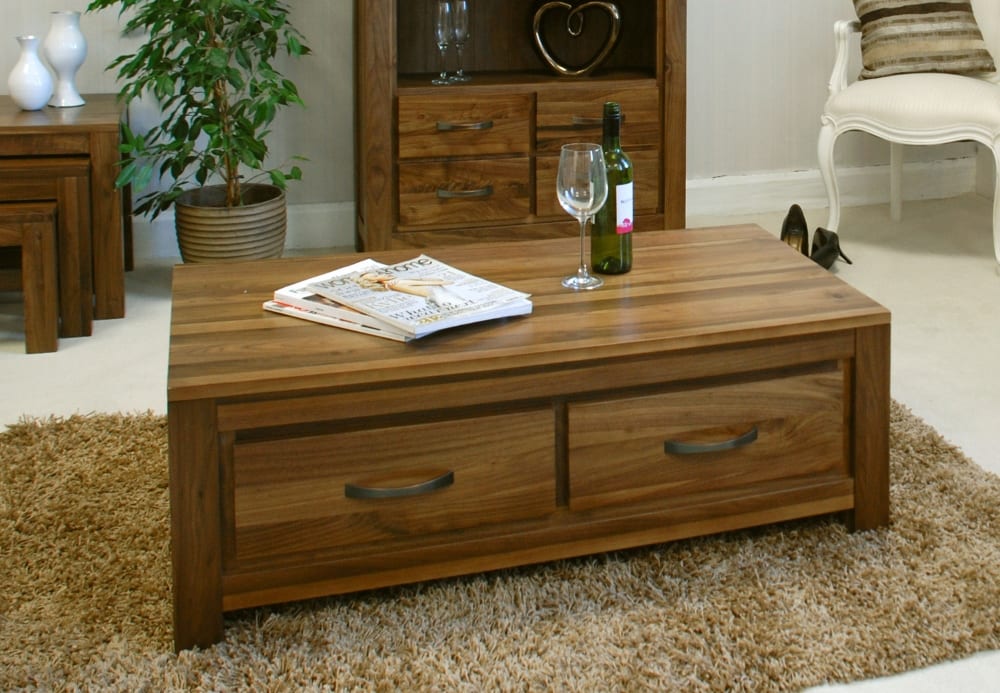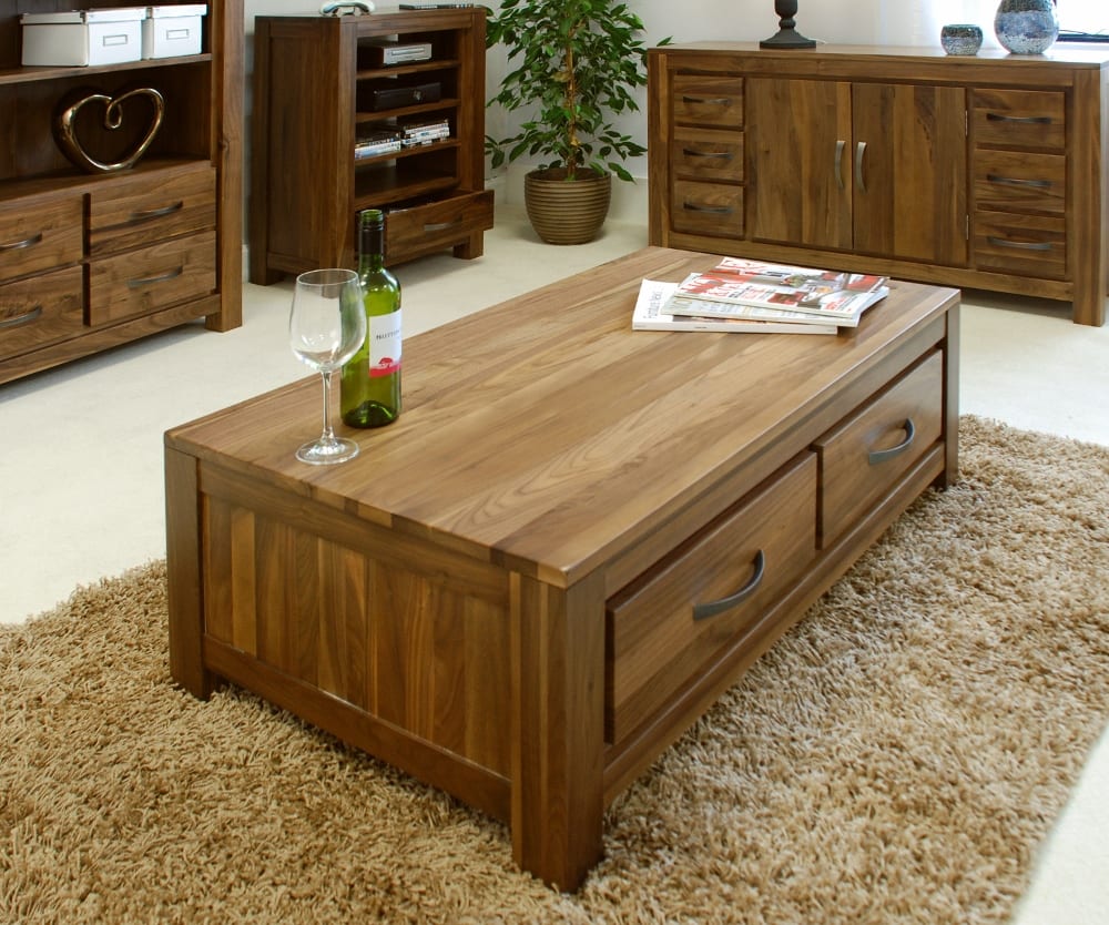 Bring a touch of elegance to your living room with the Mayan Walnut Low Four Drawer Coffee Table.