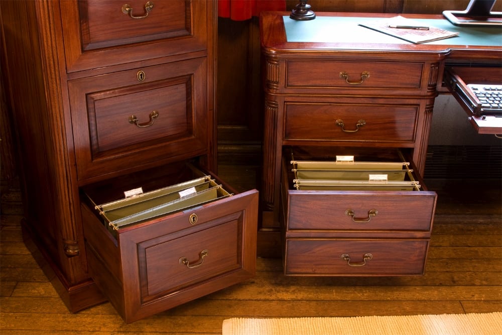 • The left pedestal has two drawers each measuring H7.5 x W43 x D35.5 cm and a 38cm deep filing drawer fitted with rails for foolscap suspension files