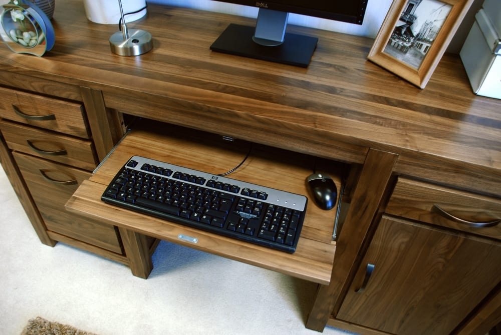 The upper central drawer has a hinged front and houses your keyboard and mouse