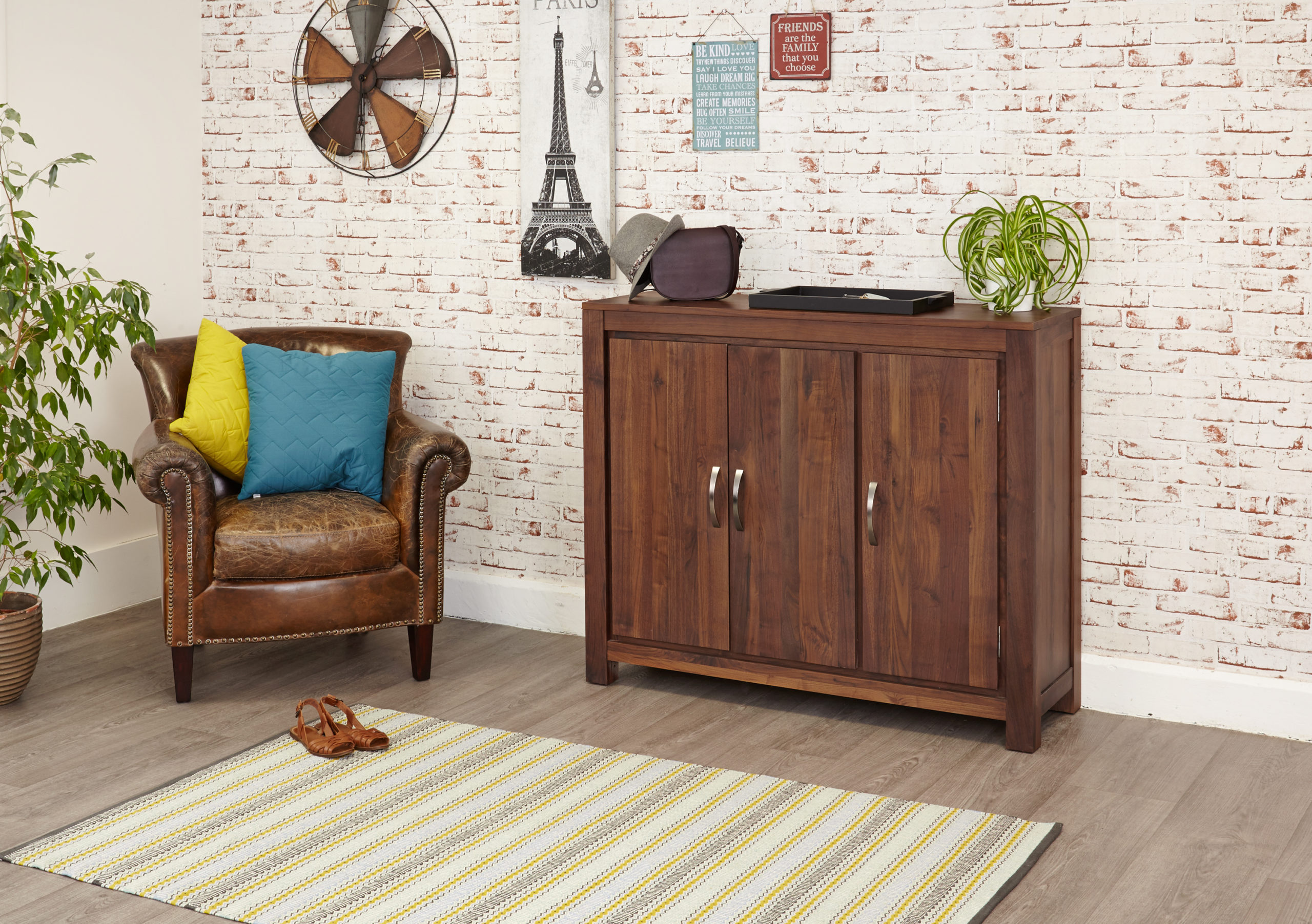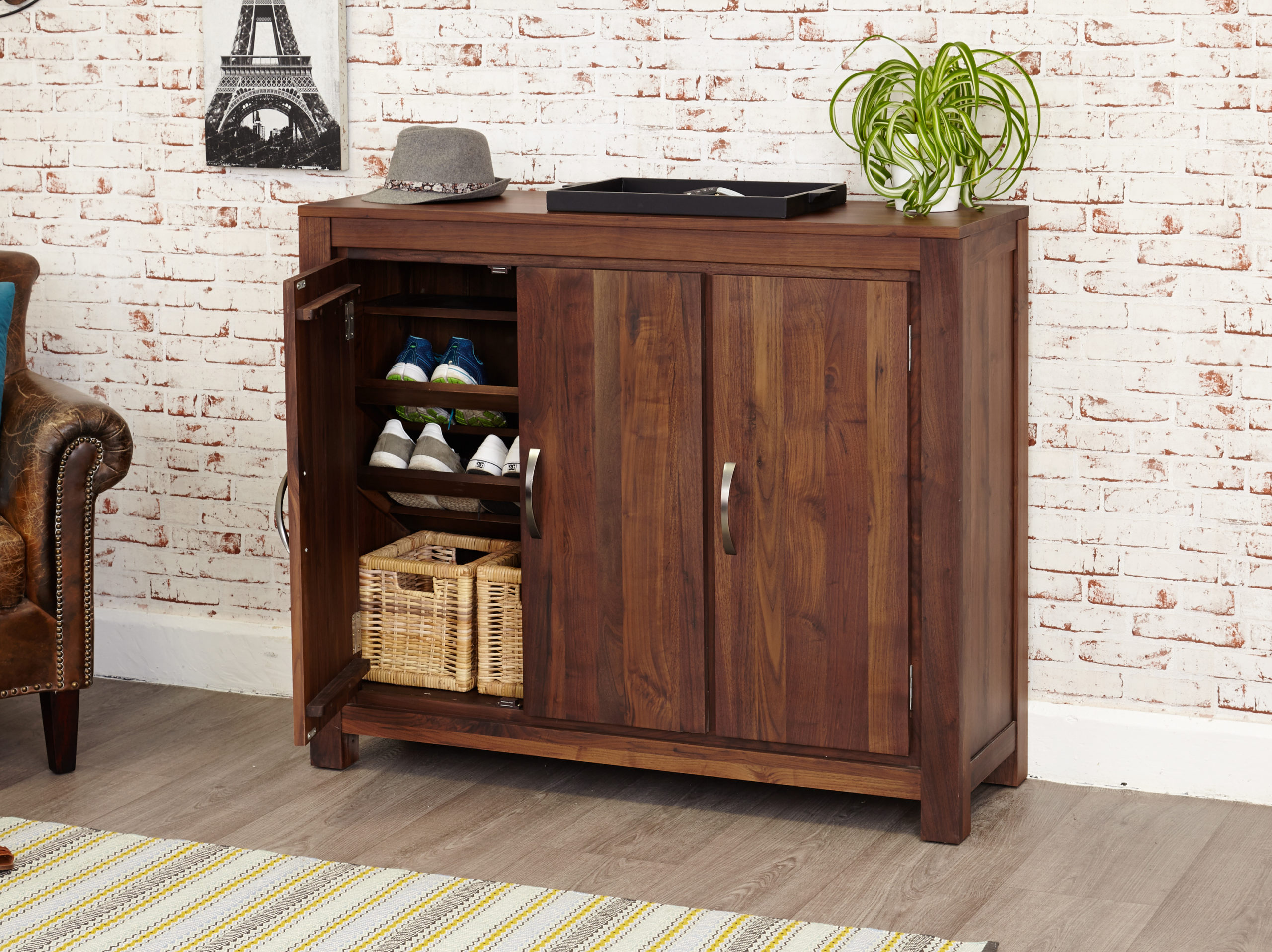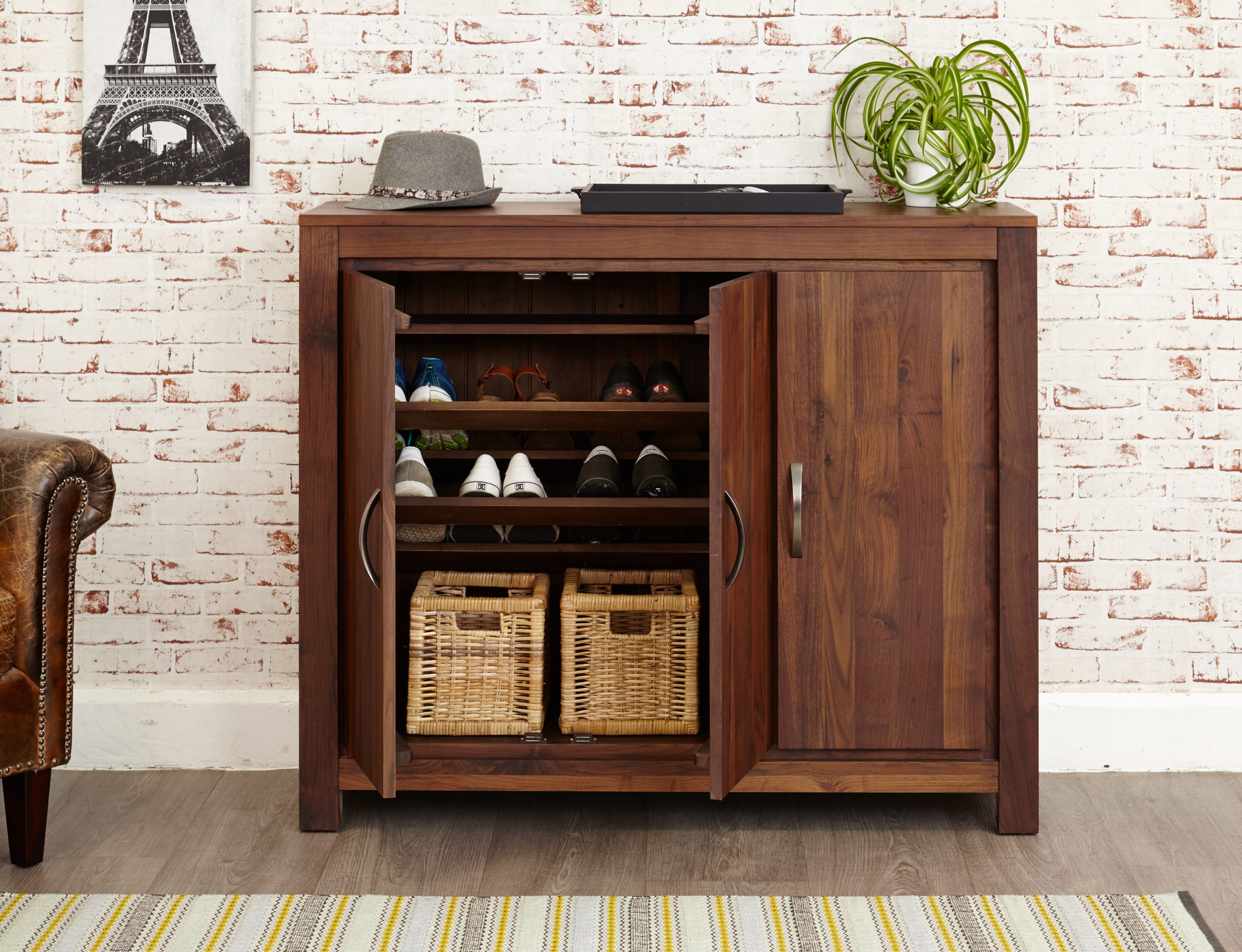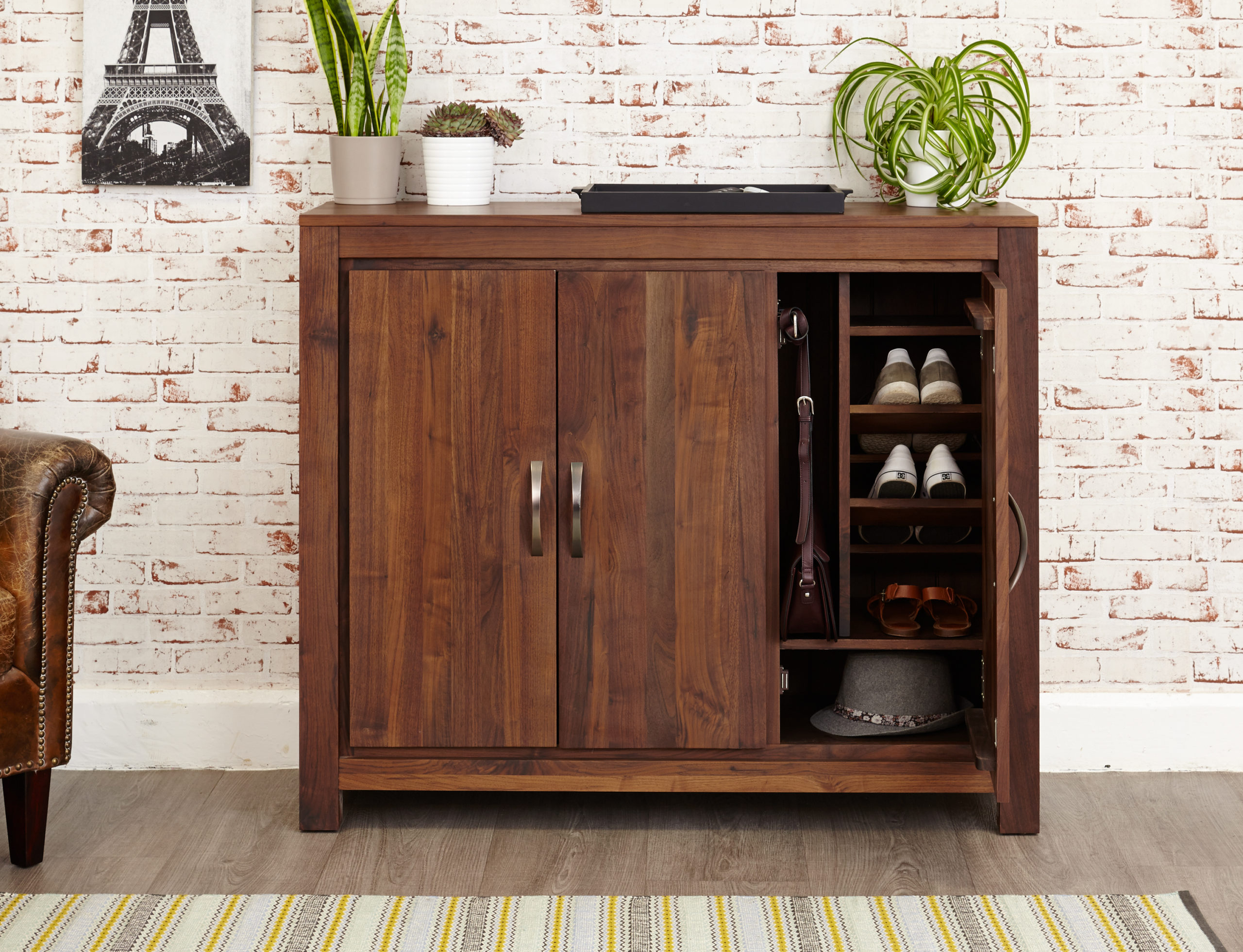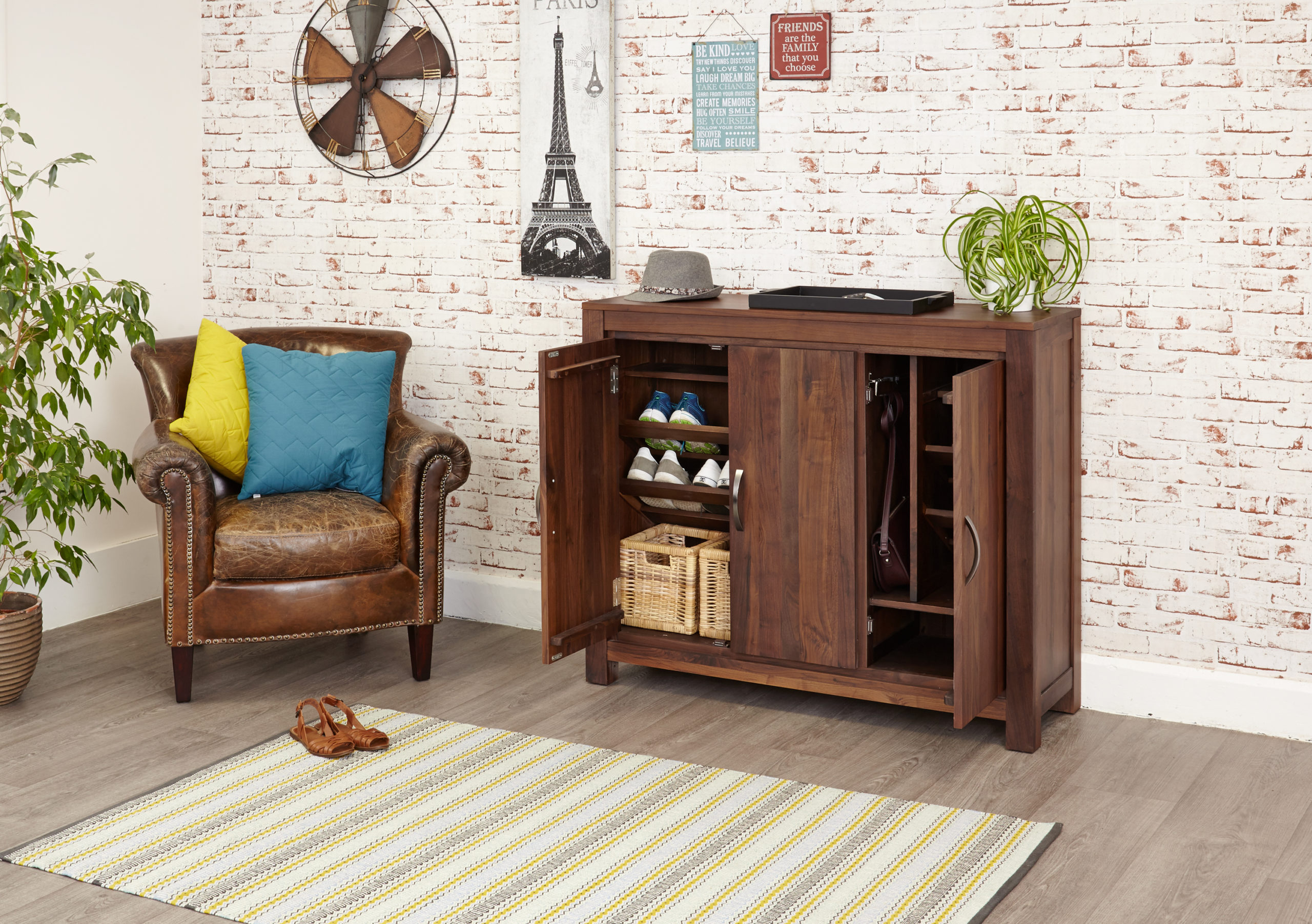 - The left hand cupboard features a top shelf for items such as keys, hats and wallets, and four shoe shelves, one of which is removable for boot storage.