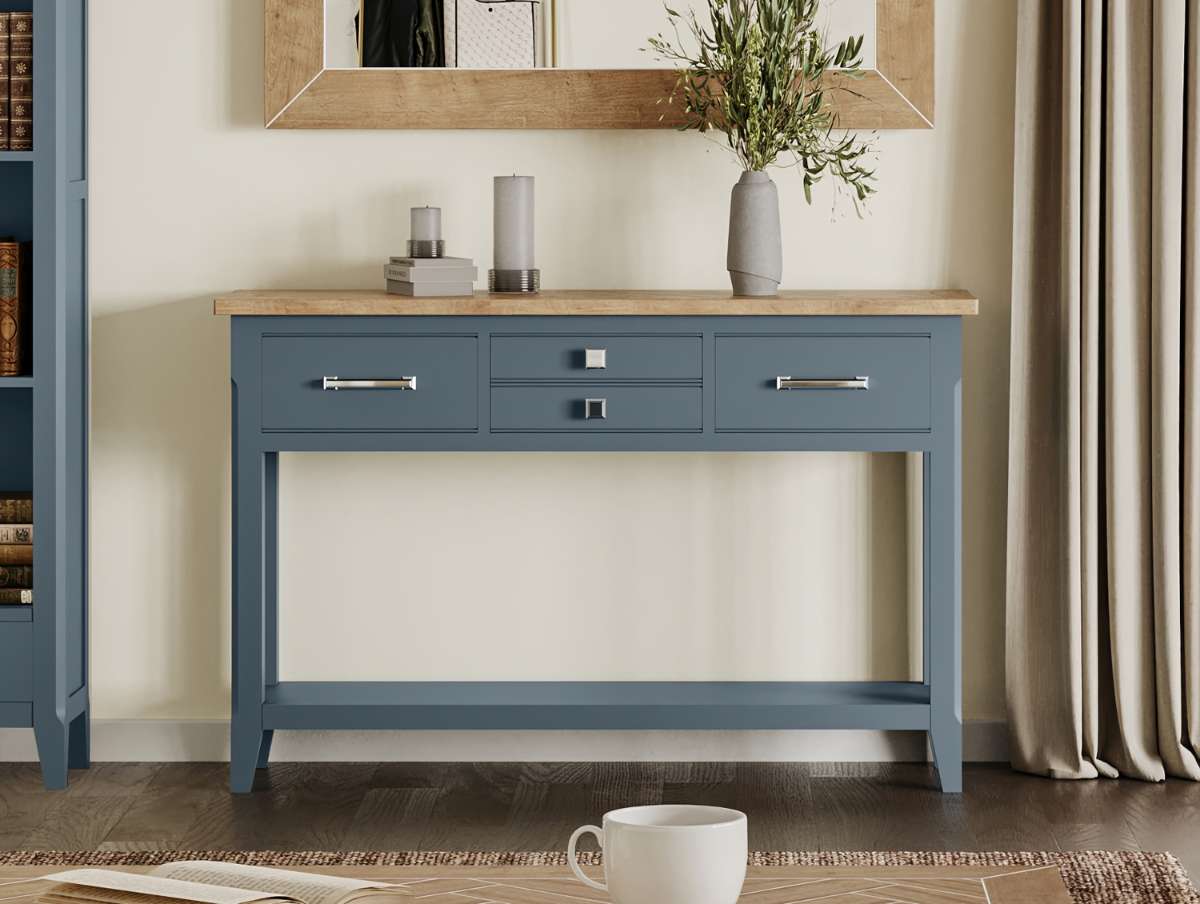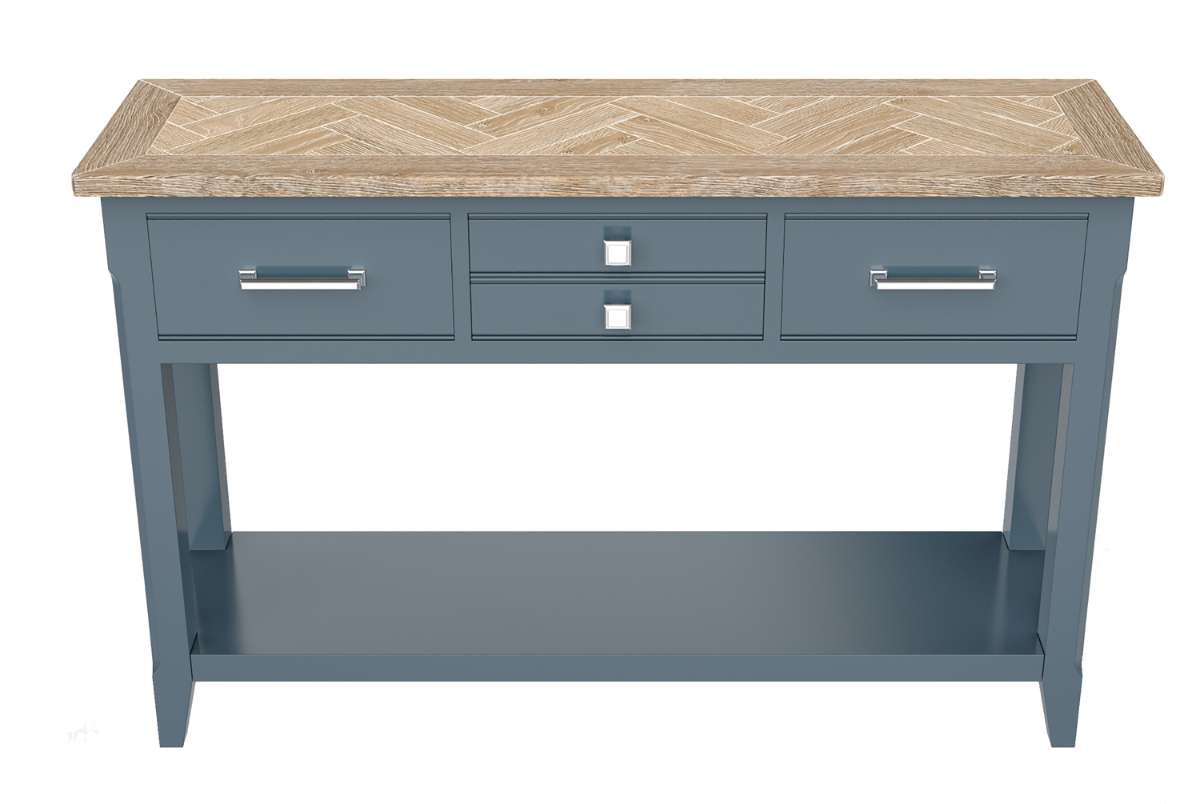 Transform your living space with the elegant and timeless Signature Blue – Console Table from Bathrooms & More Store in the UK. Crafted with meticulous attention to detail, this console table features a distressed oak parquet top with a hand-rubbed white paint finish for a stunning and durable look. With two large drawers, two small drawers, and an open shelf, this console table offers both style and functionality. Plus, with free delivery and 14-day returns, you can shop with confidence. Explore our exclusive Signature Blue collection and elevate your home decor today.