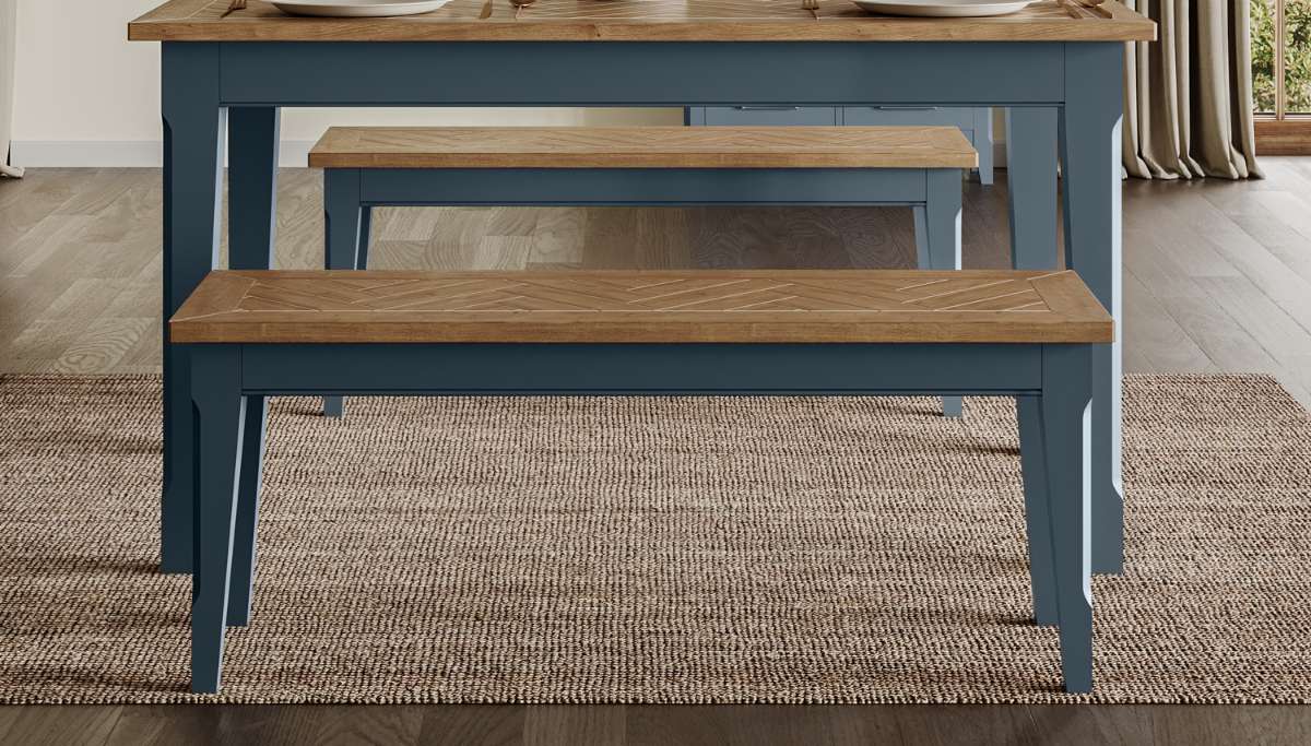 Introducing our Signature Blue Dining Bench (130) from Bathrooms & More Store in the UK! This stunning piece is crafted with meticulous attention to detail, featuring a hand-finished oak parquet top with a delicate distressing and white paint finish. With free delivery and 14 day returns, you can bring this high-end piece into your home with ease.