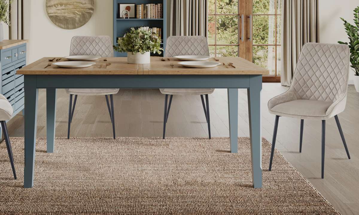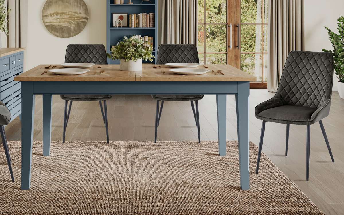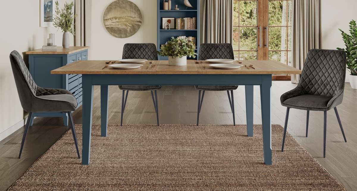Introducing the Signature Blue Extending Dining Table from Bathrooms & More Store in the UK, where quality craftsmanship meets timeless elegance. The oak parquet top is meticulously hand-finished with a distressed white paint and clear lacquer for a durable and stunning appearance. With free delivery and 14-day returns, this table also comes with a FIVE YEAR warranty for your peace of mind. Experience the luxury of the Signature Blue collection for yourself today.