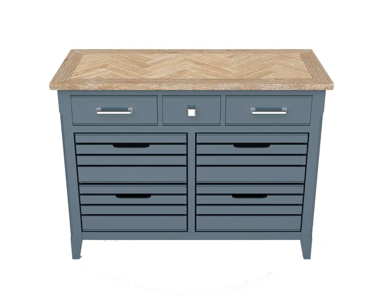 Introducing our stunning Signature Blue Sideboard/Servery, meticulously handcrafted with attention to detail in every aspect of its design. This exquisite piece features a unique oak parquet top that is hand-distressed and painted with a white finish, creating a durable and beautiful appearance. With three small drawers and four large ‘crate’ styled drawers, this sideboard offers both style and functionality. Enjoy free delivery and 14 day returns on this high-end piece, backed by a FIVE YEAR warranty against manufacturing issues. Explore the rest of our exclusive Signature Blue collection for more timeless pieces. No assembly required for this elegant addition to your home.