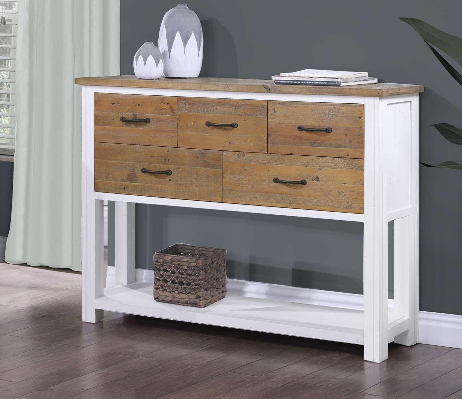 Add a touch of elegance and sustainability to your home with our Splash of White sideboard / console table. Handcrafted from 100% reclaimed timber, each piece in this high-end collection is uniquely characterful and designed to last a lifetime. With five large drawers and an open shelf, this stunning piece offers both style and functionality. Plus, with free delivery and 14-day returns, you can shop with confidence. Experience the beauty of the Splash of White range today.