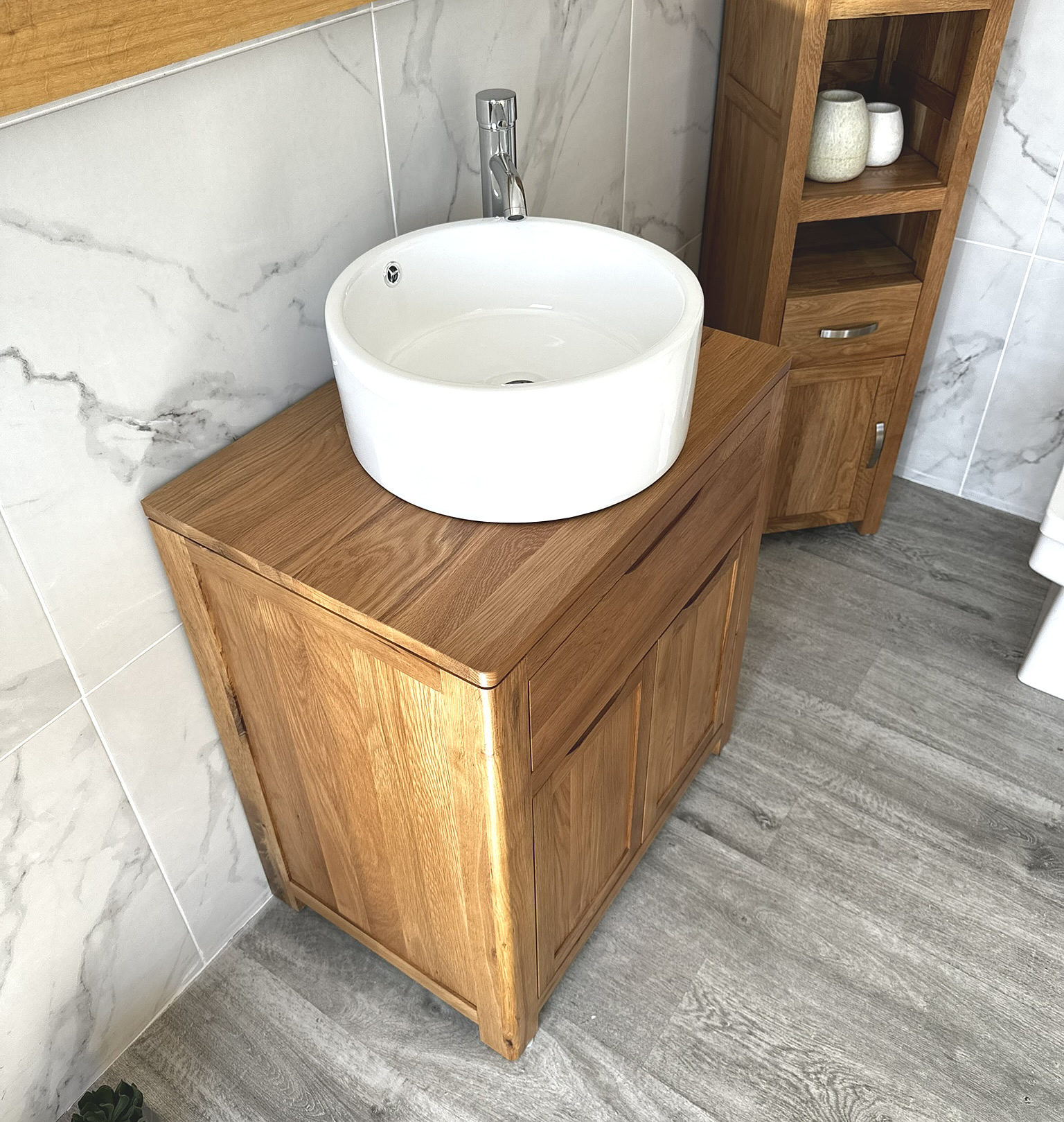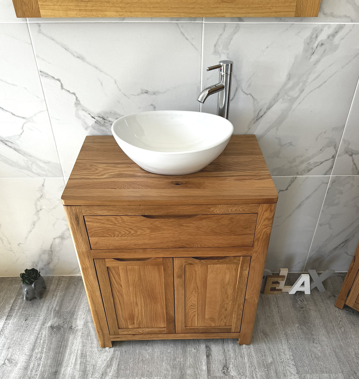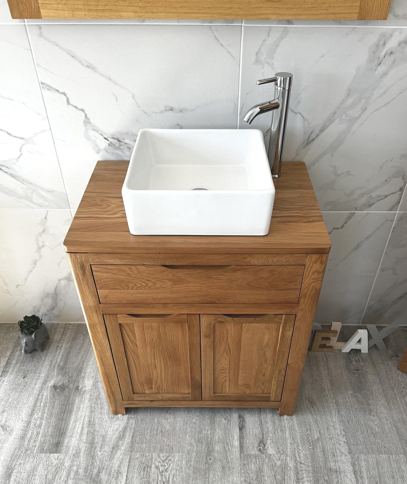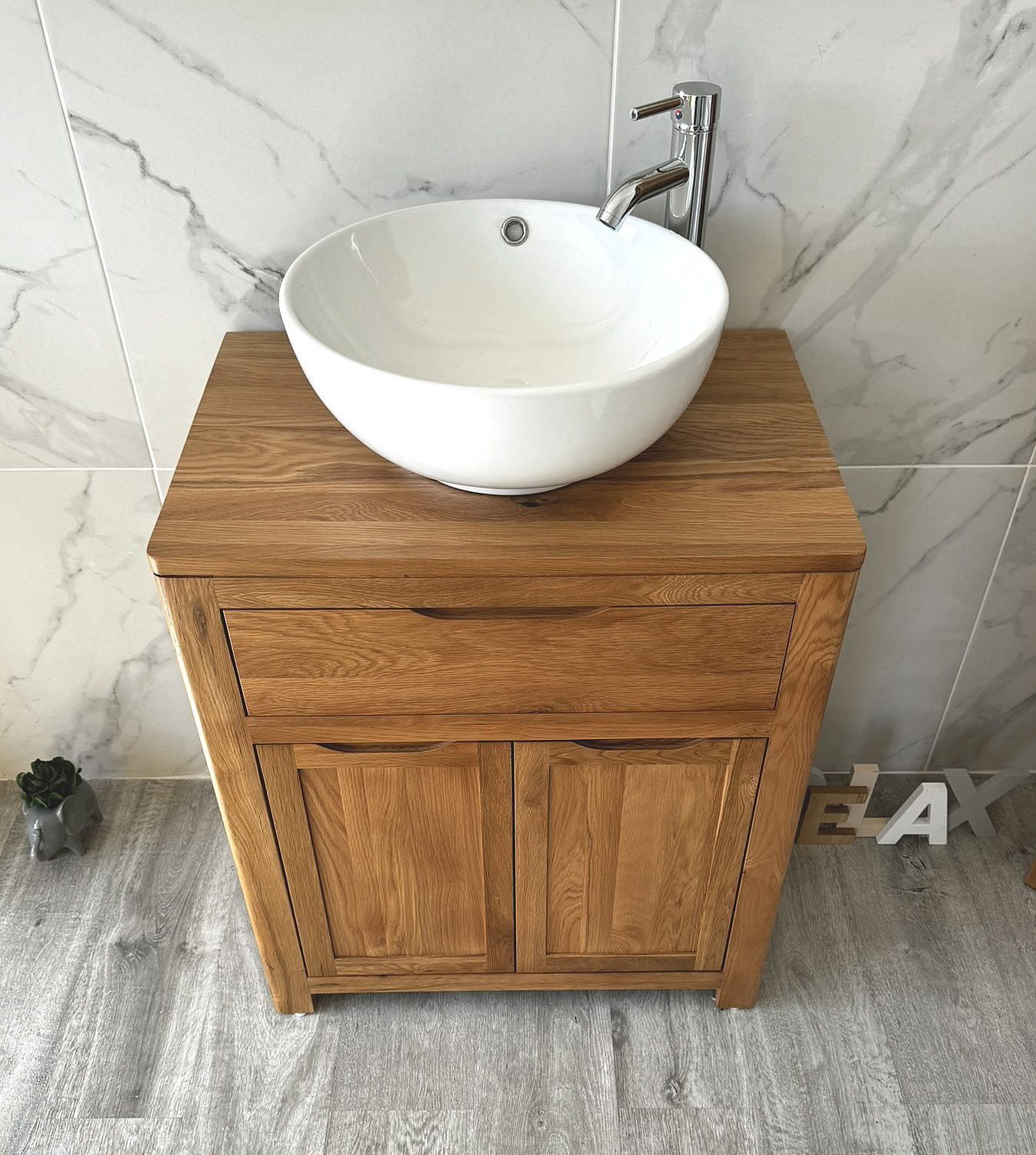 White Ceramic Vanity Basin on Solid Oak Top & Oak Vanity Unit