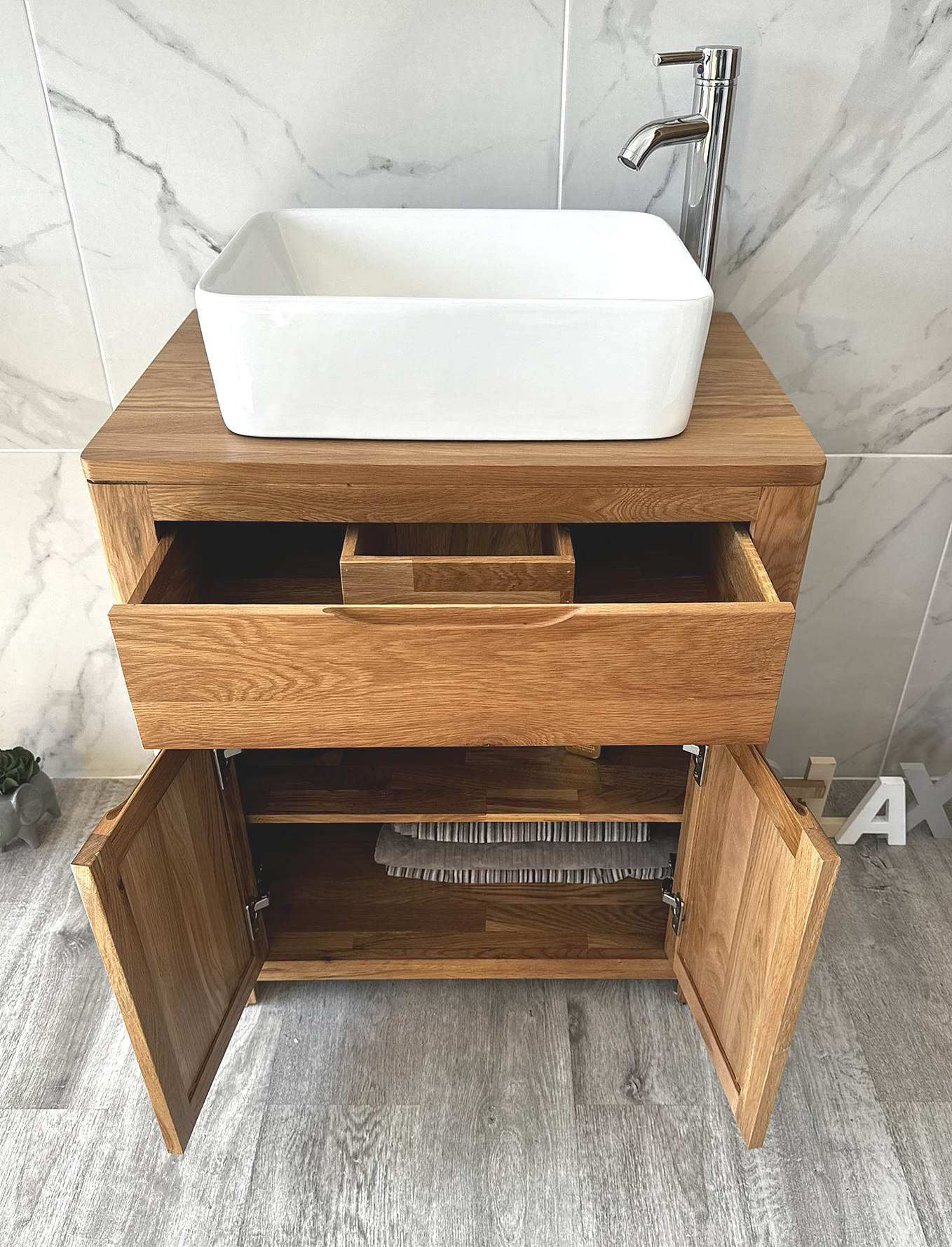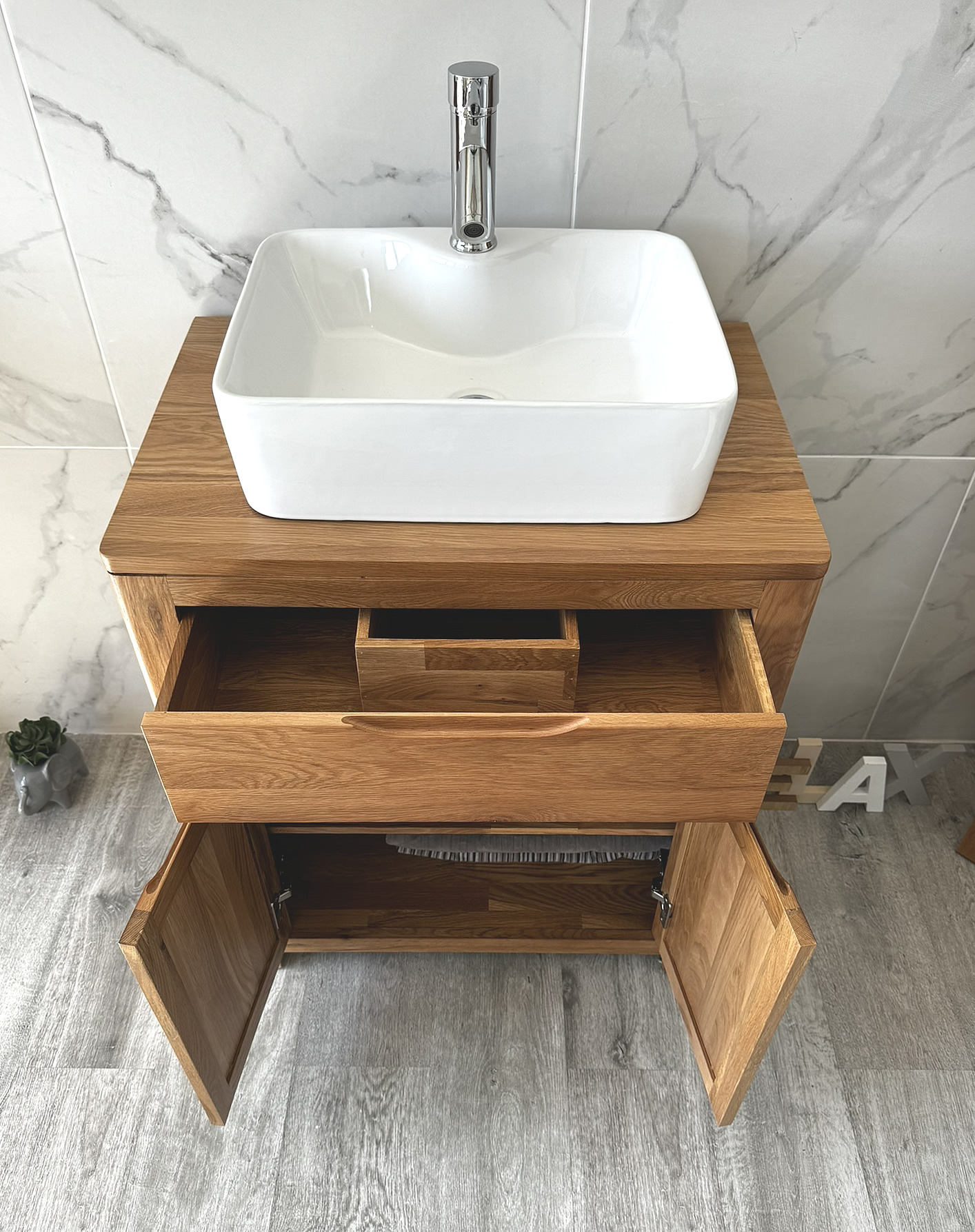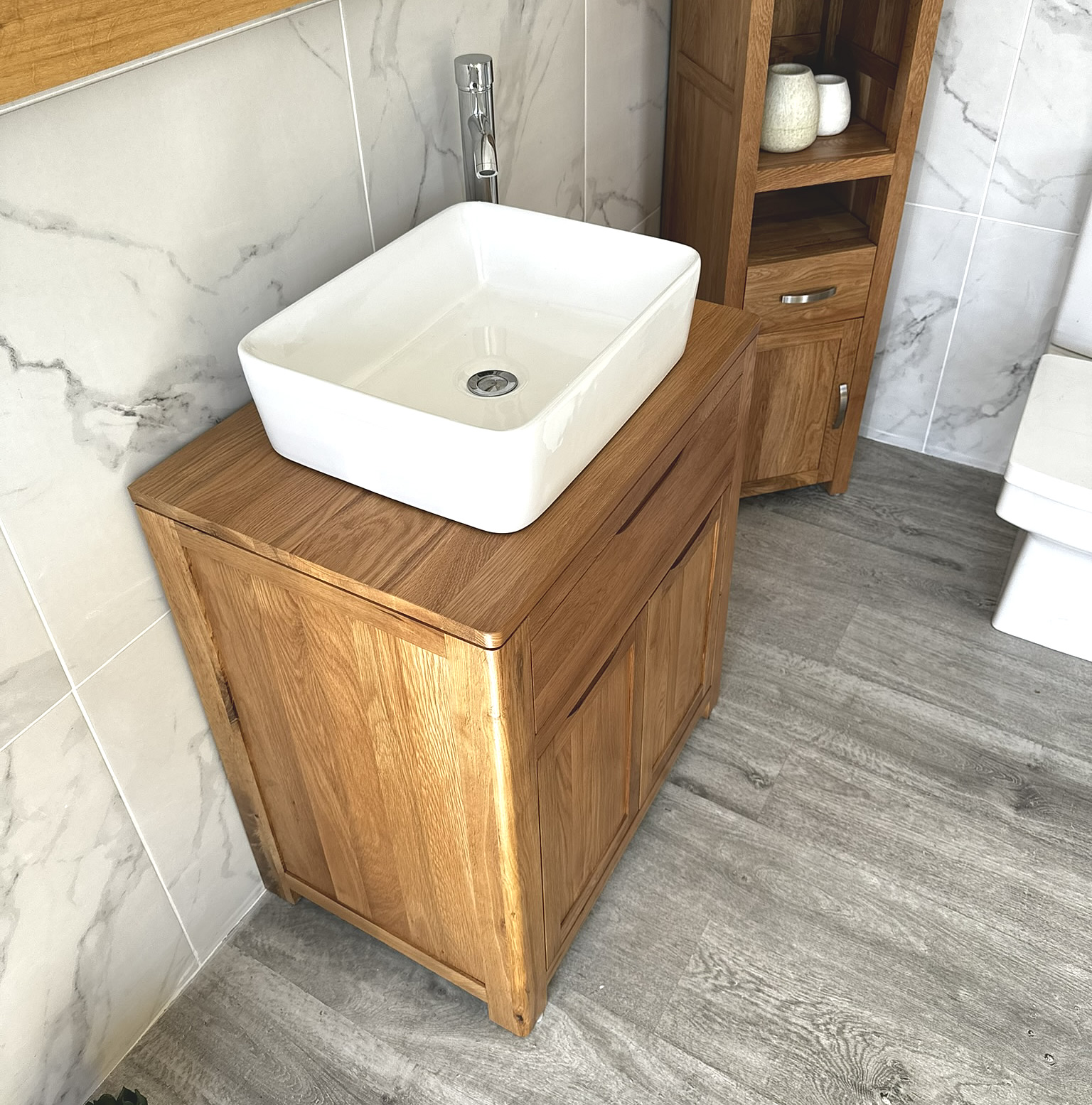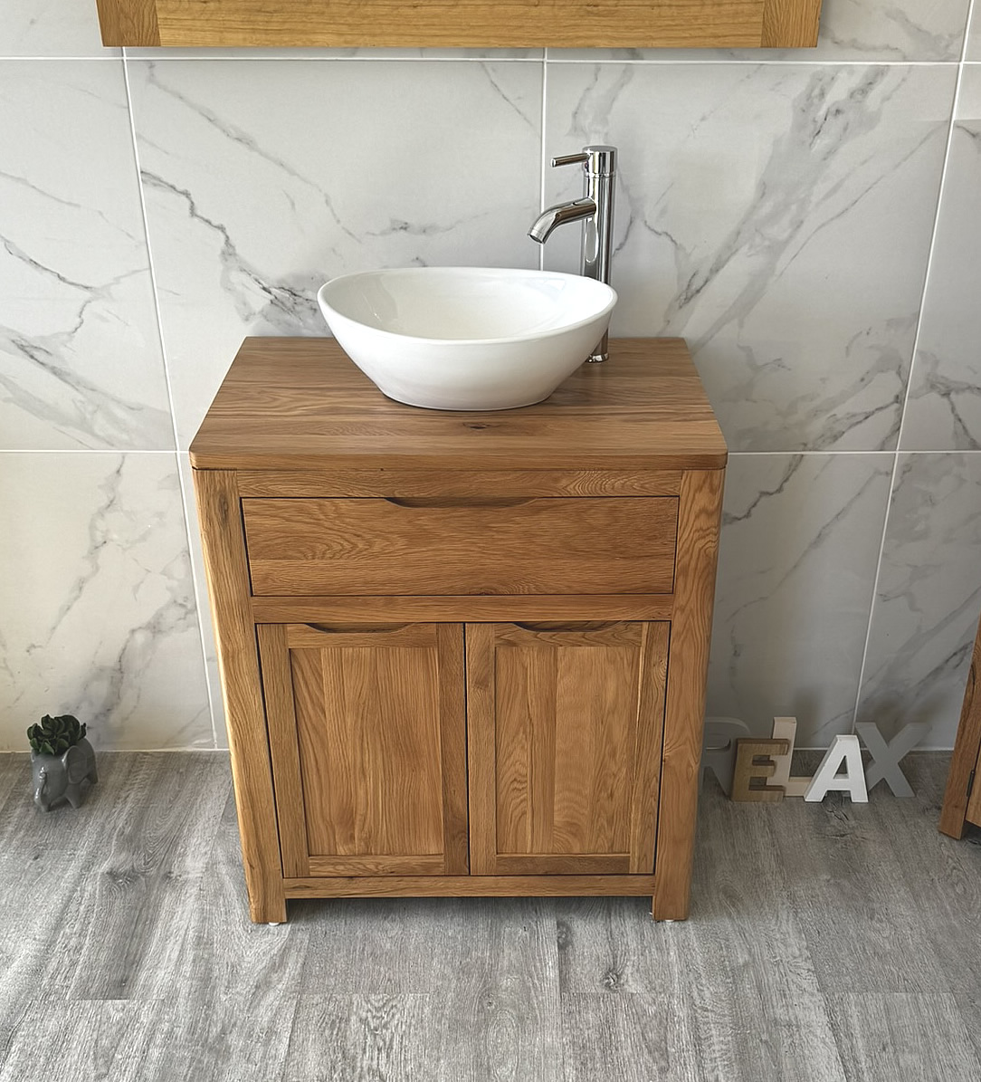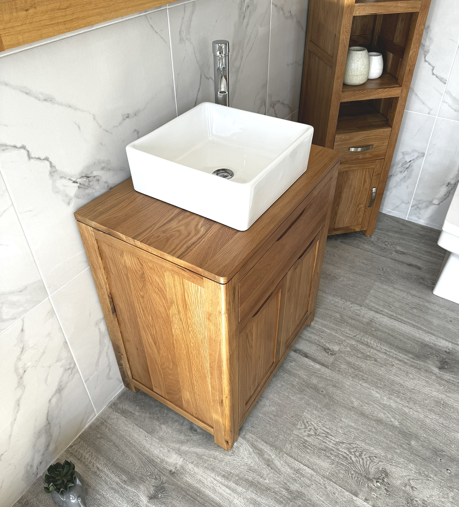 White Ceramic Vanity Basin on Solid Oak Top & Oak Vanity Unit