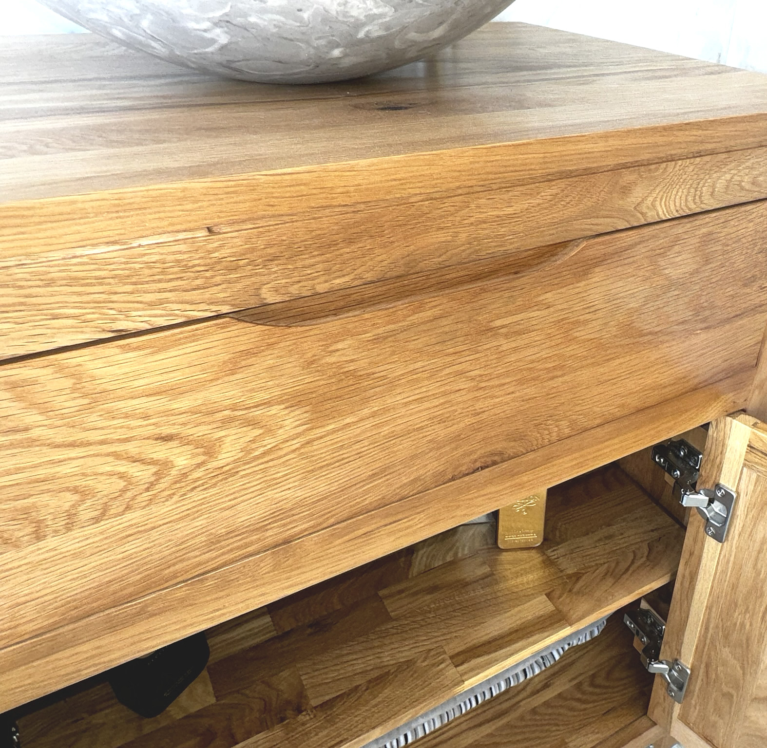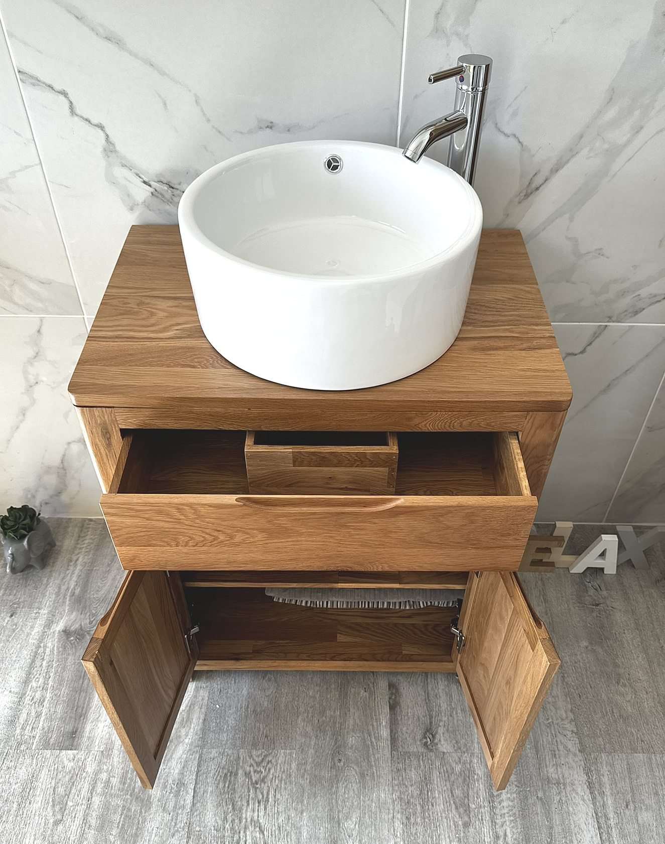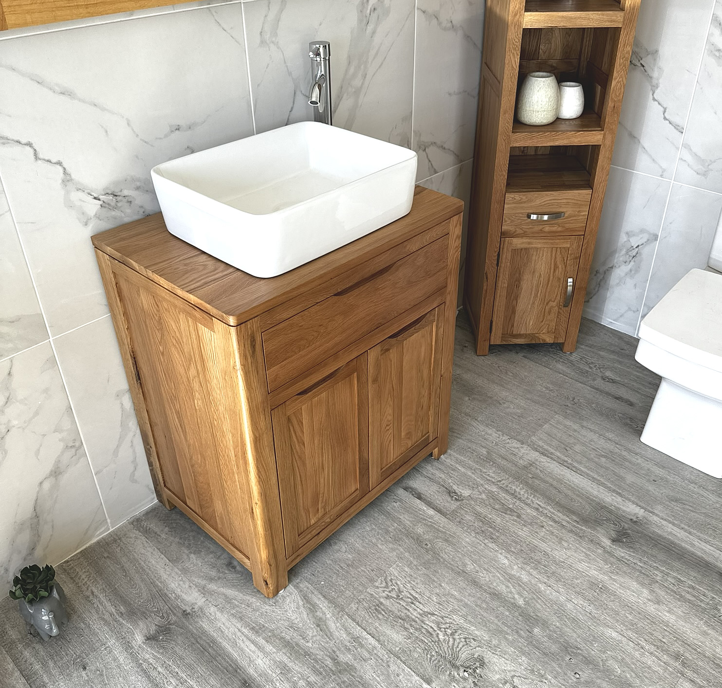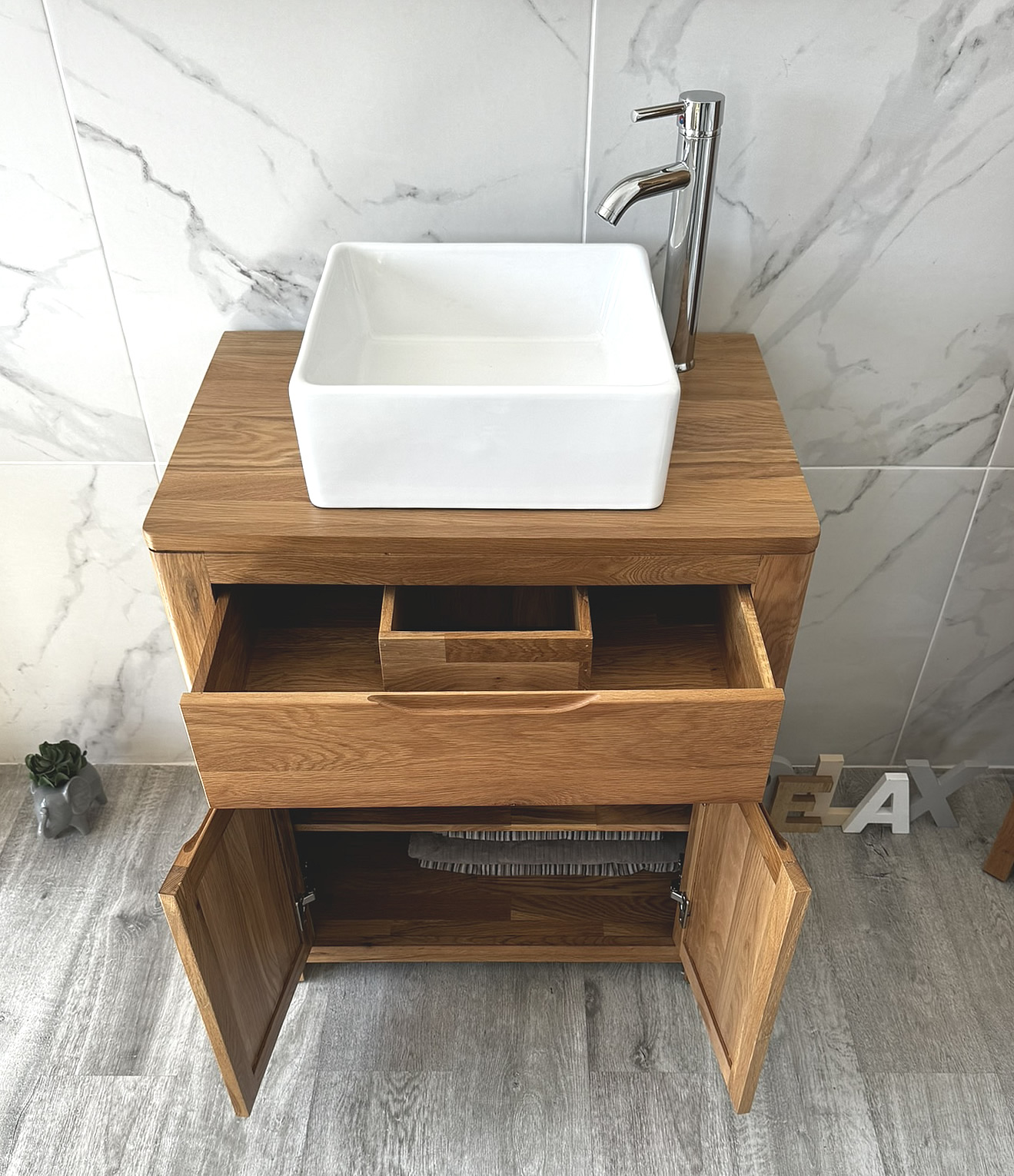 White Ceramic Vanity Basin on Solid Oak Top & Oak Vanity Unit