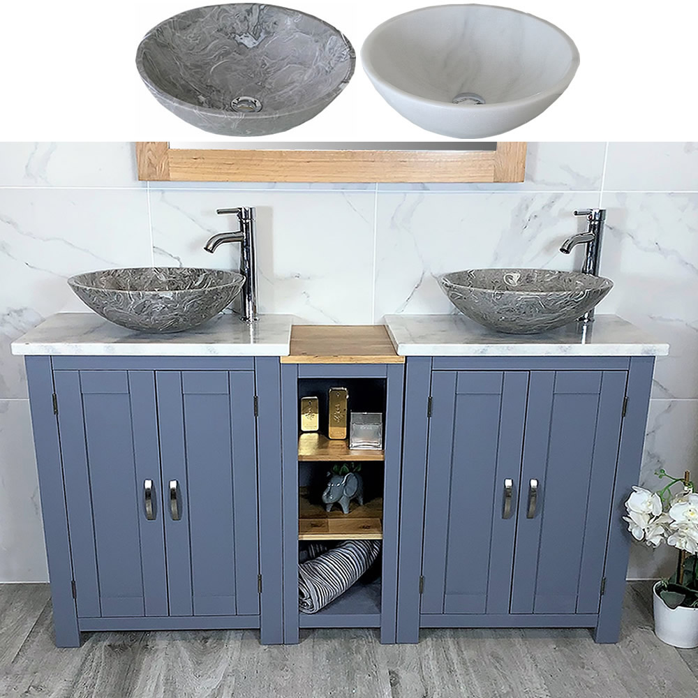 - Two round curved marble bowls of choice, see the dimensions of each basin below: