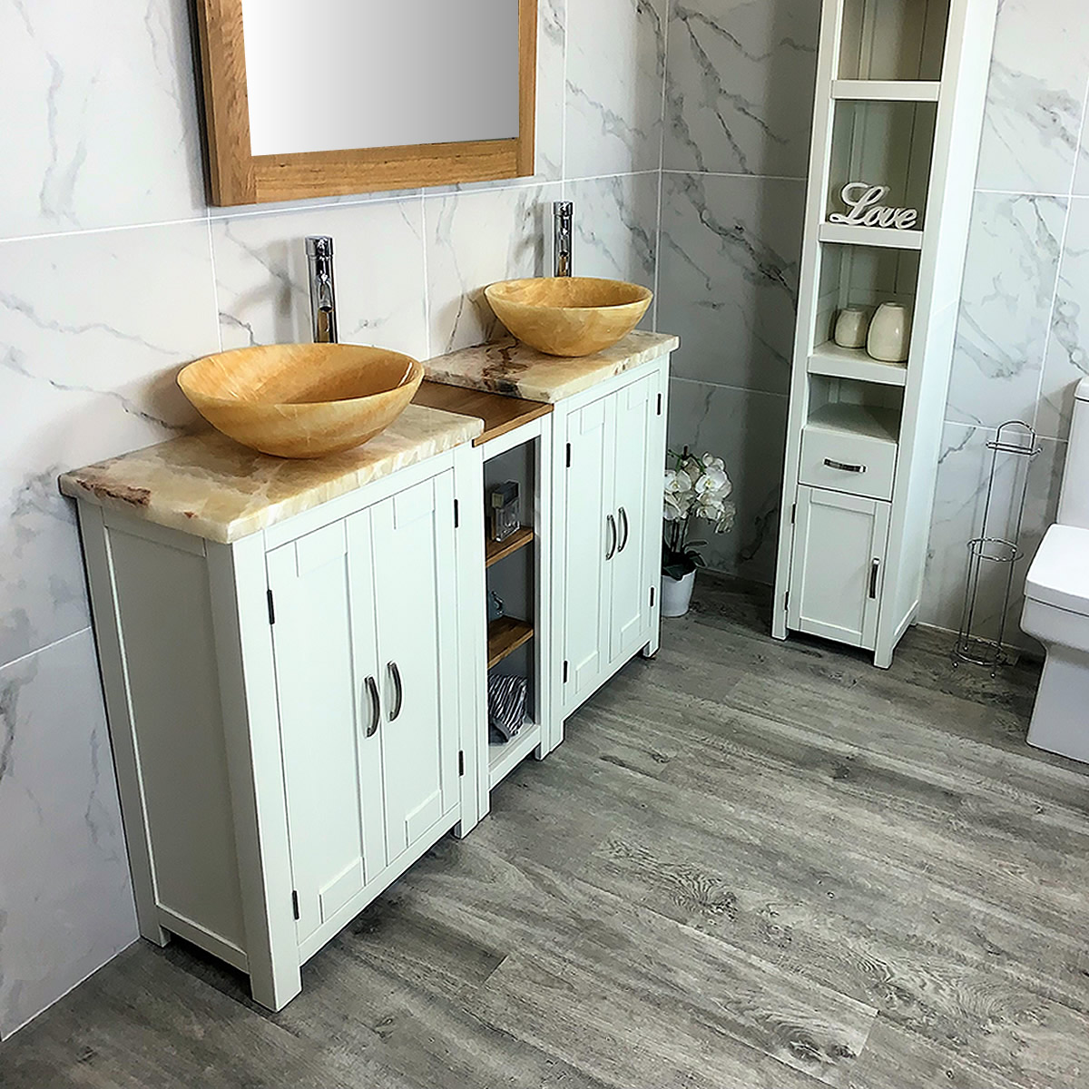 Stunning, luxurious double basin, onyx topped vanity with loads of storage space. Completed with 2 golden onyx basins & chromed mixer taps and plugs.