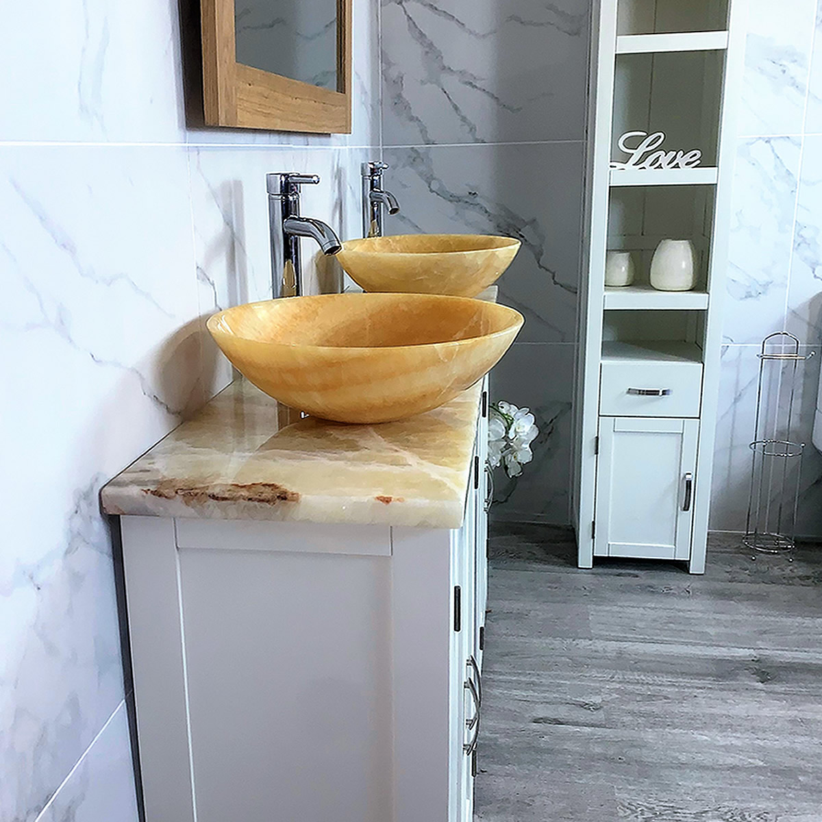 - This stunning golden honey onyx is a beautiful translucent stone that is ideal for creating a backlit bathroom vanity top.