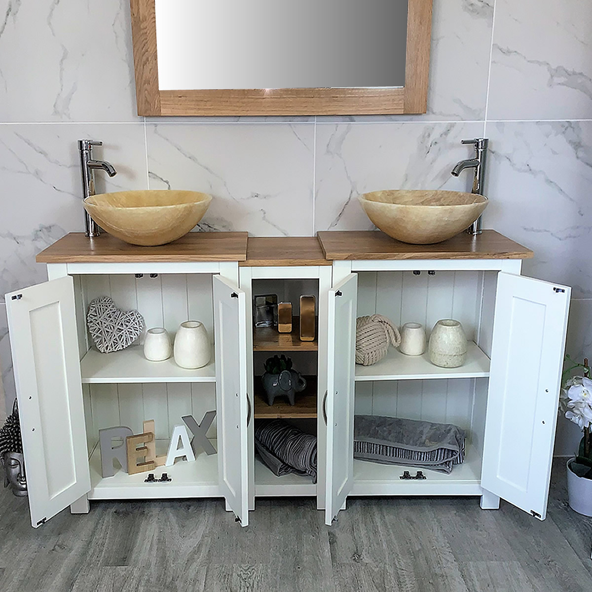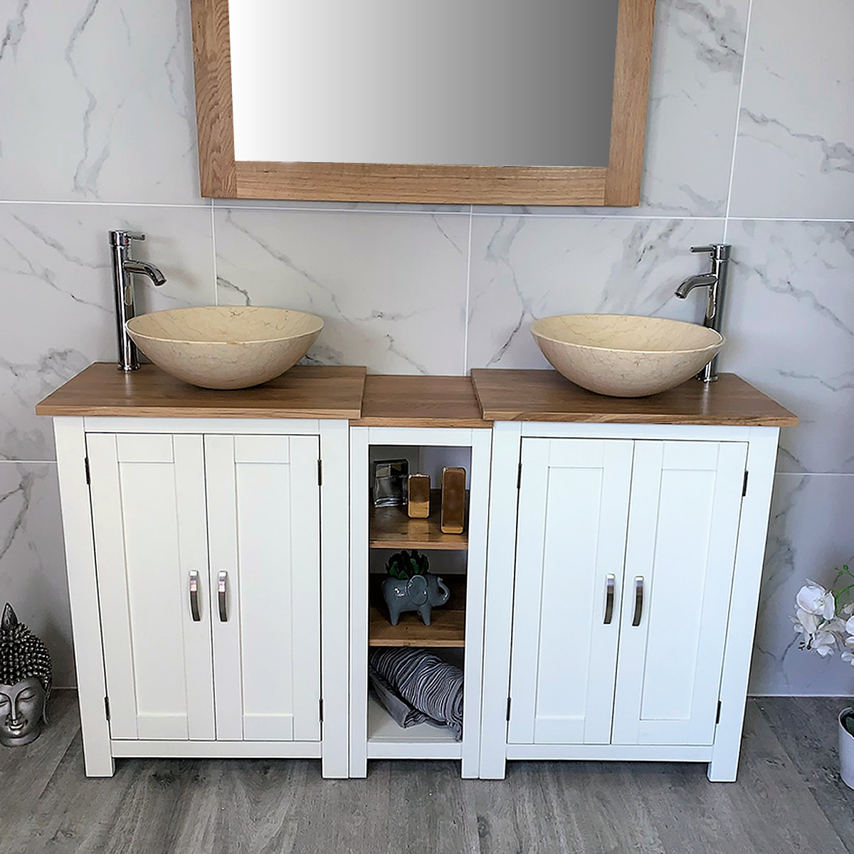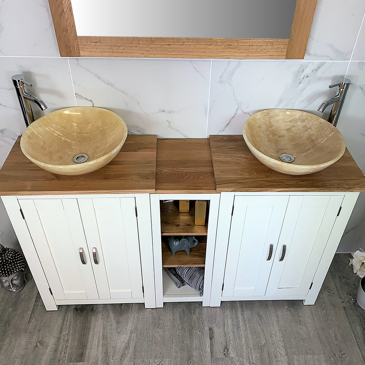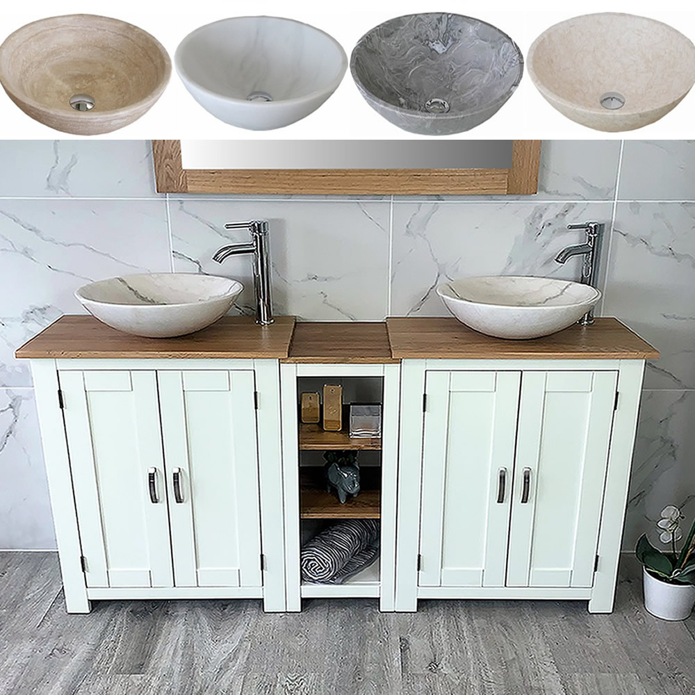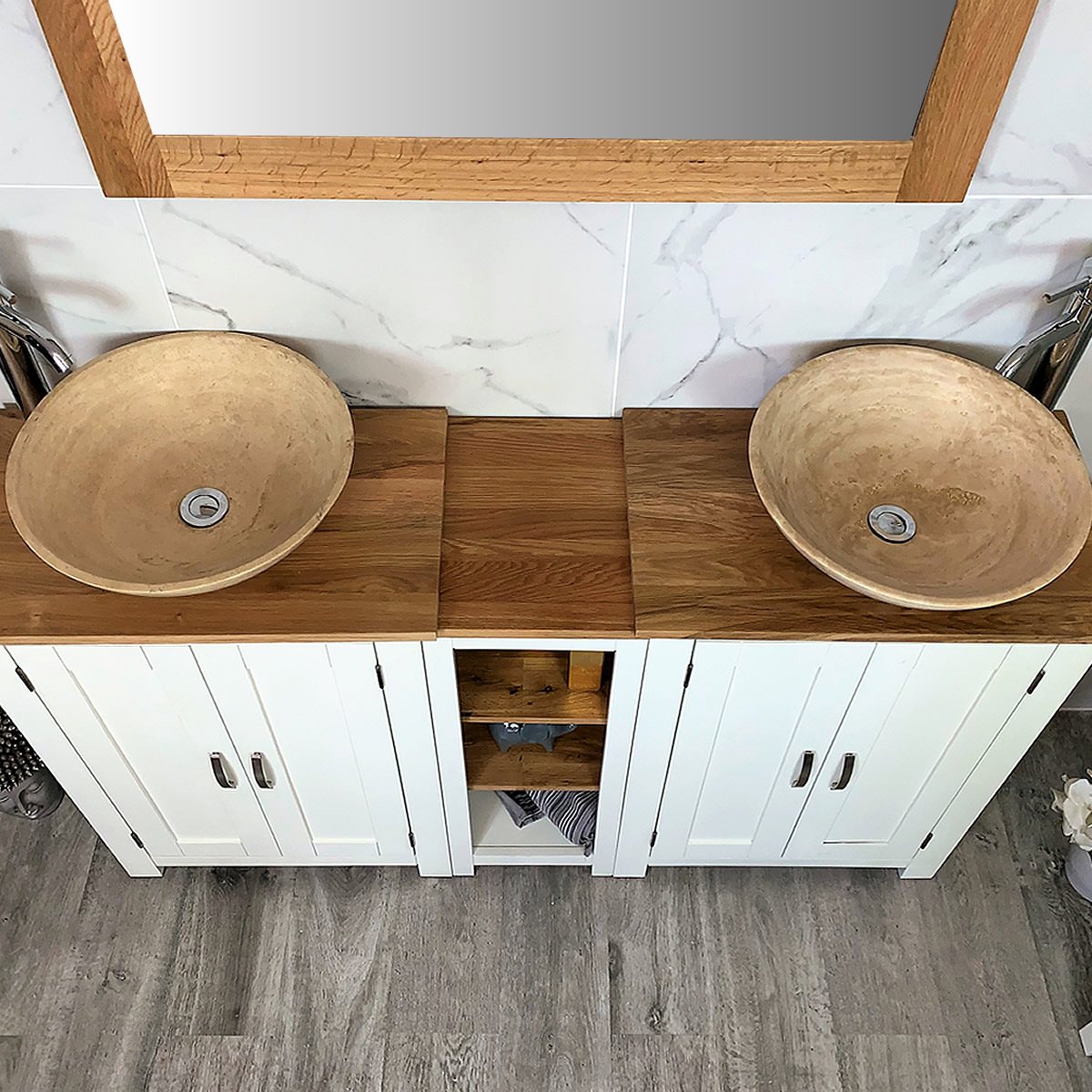 Double Basin Vanity Unit with Oak Top & Two White Marble Basins of your Choice