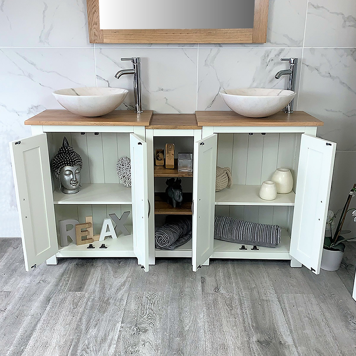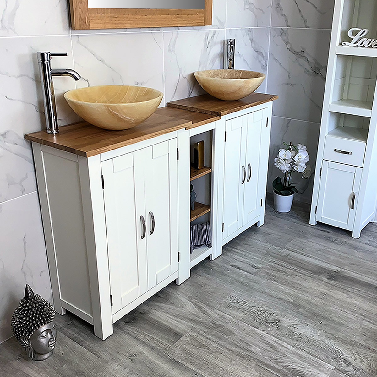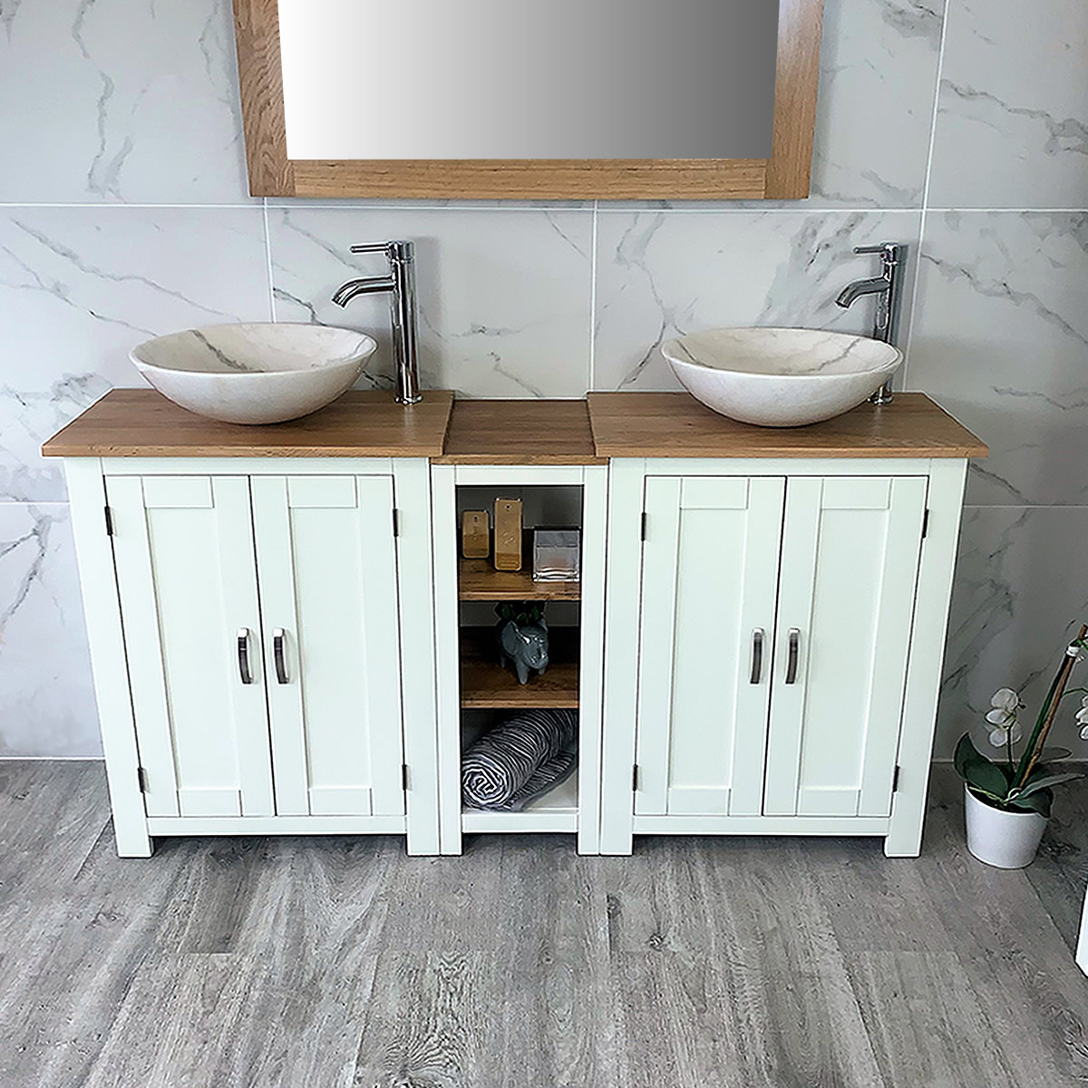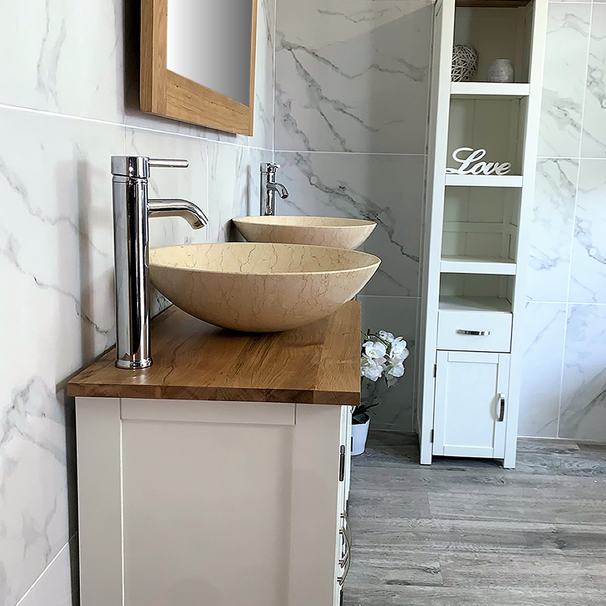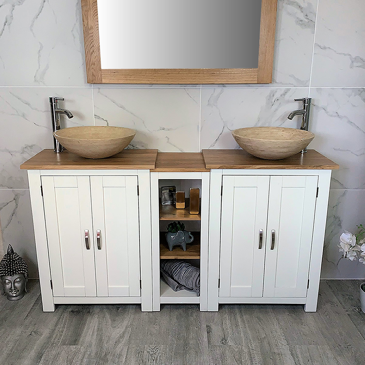 Double Basin Vanity Unit with Oak Top & Two White Marble Basins of your Choice