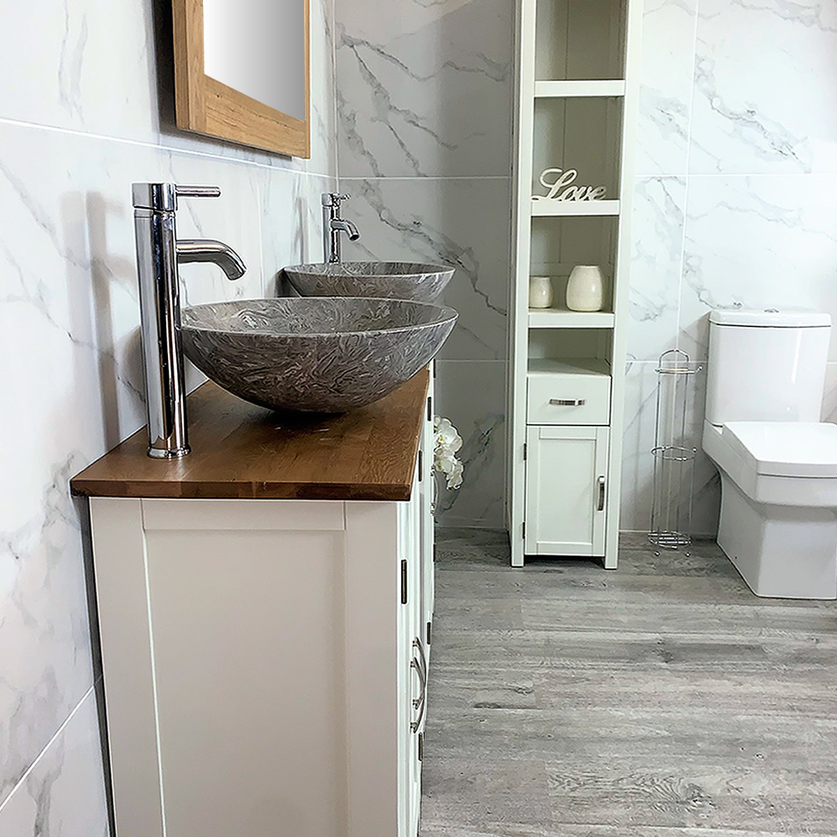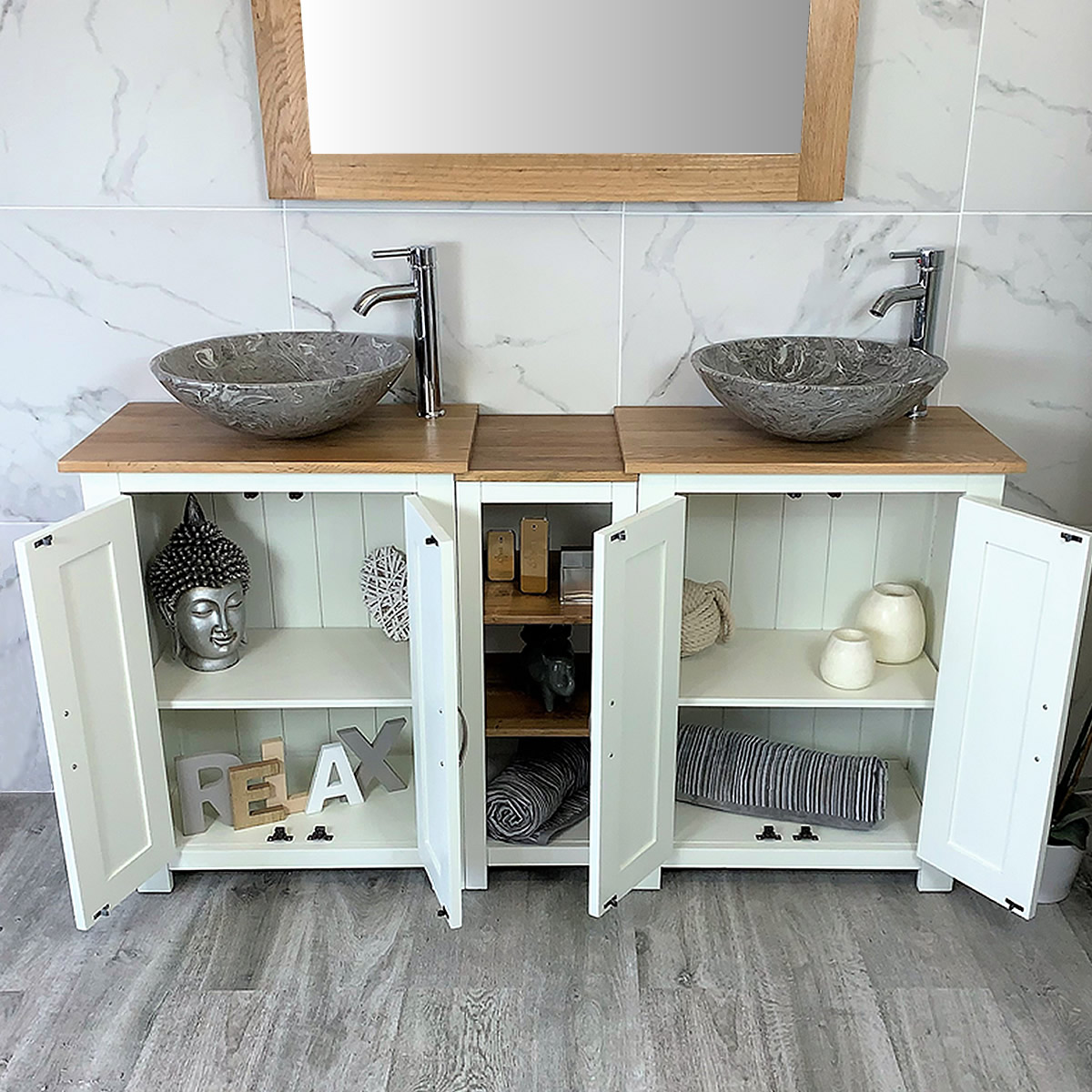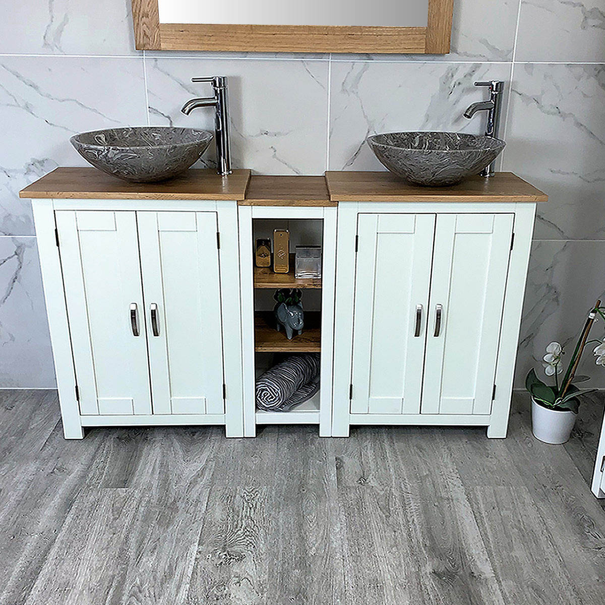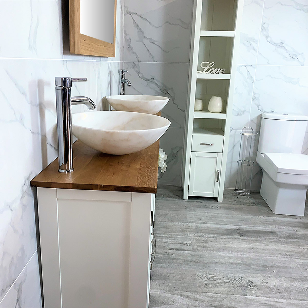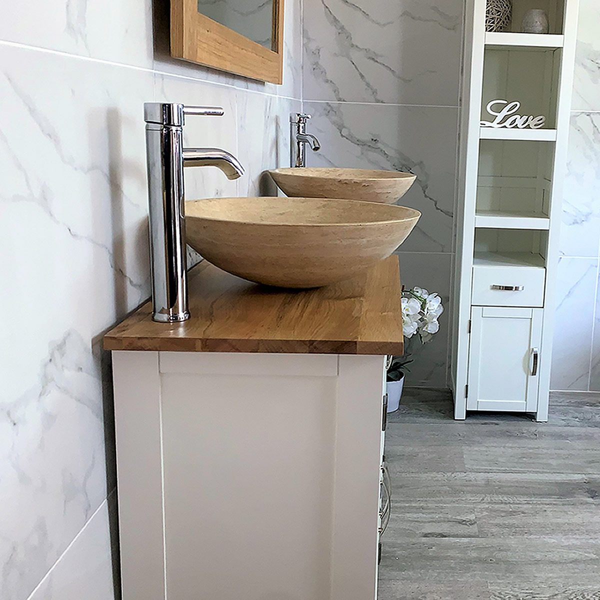 Double Basin Vanity Unit with Oak Top & Two White Marble Basins of your Choice