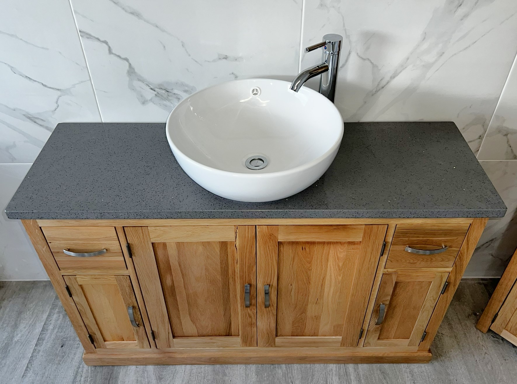 - One stunning single pre-drilled black quartz work top.
