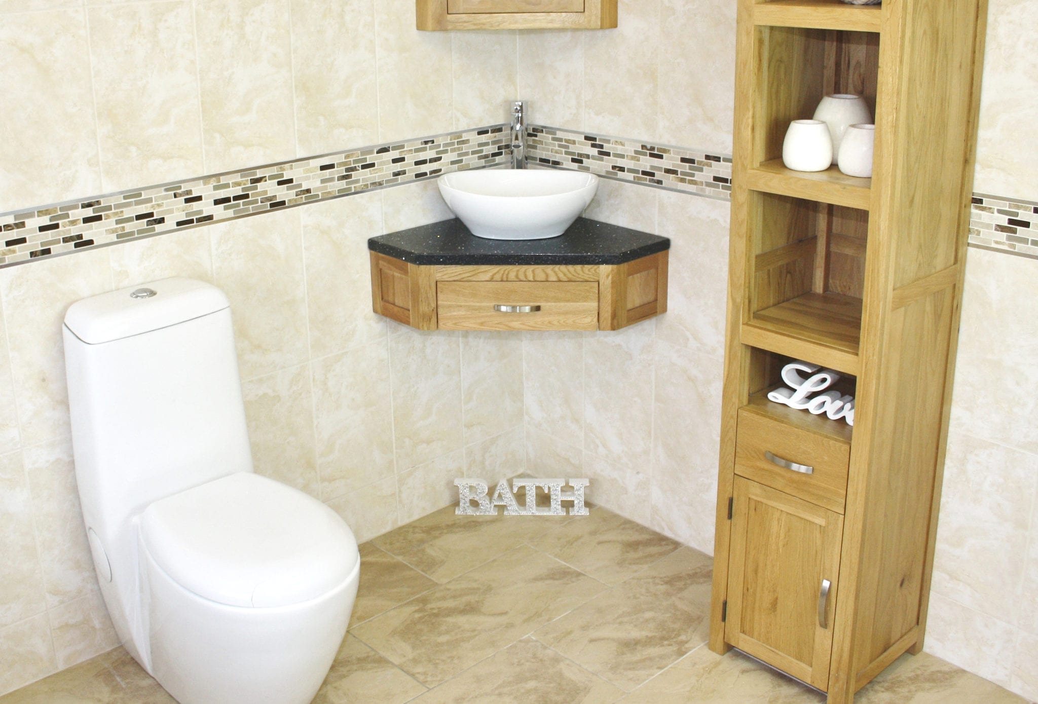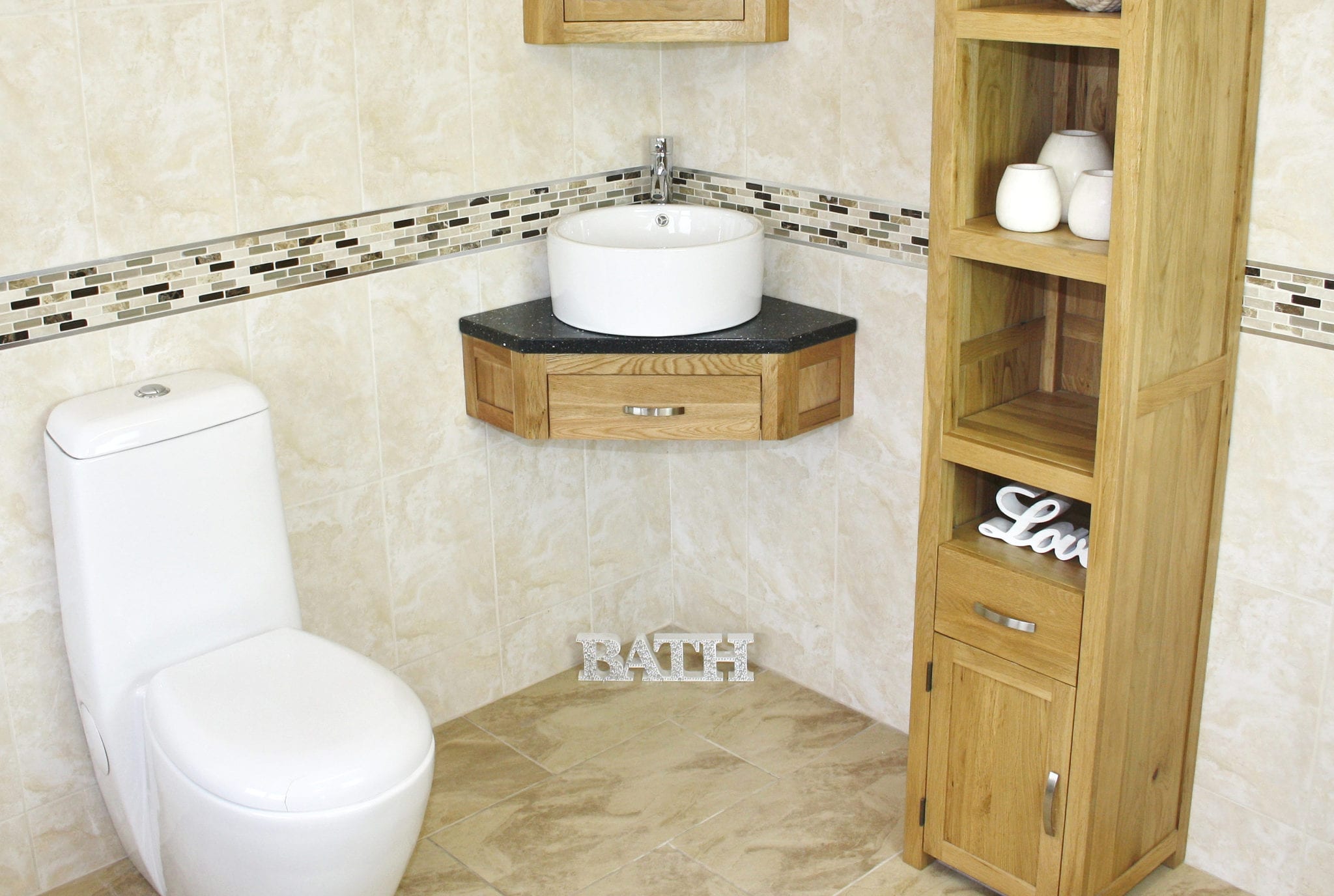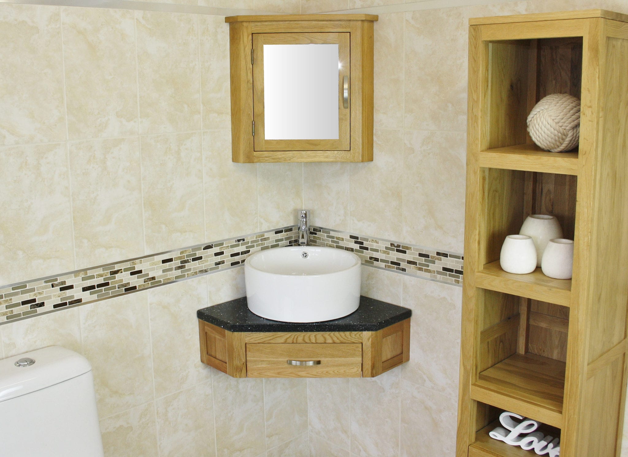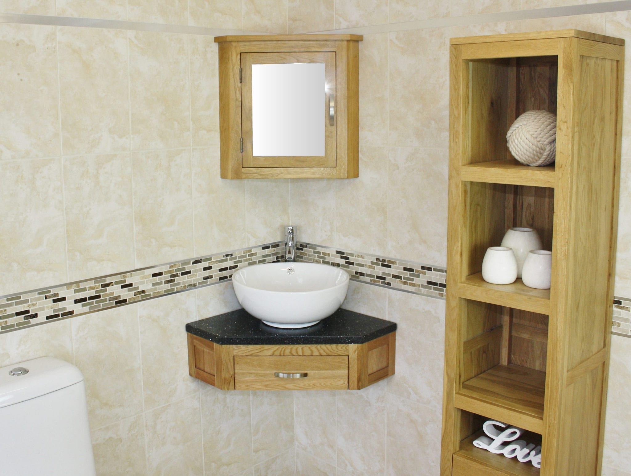 Mirrored corner cabinet and tall storage unit in image are not included but are optional extras, please see below.