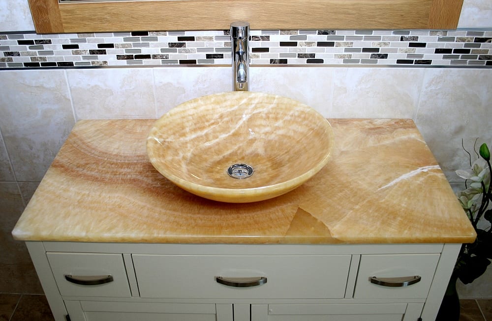 • This stunning golden honey onyx is a beautiful translucent stone that is ideal for creating a backlit bathroom vanity top.
