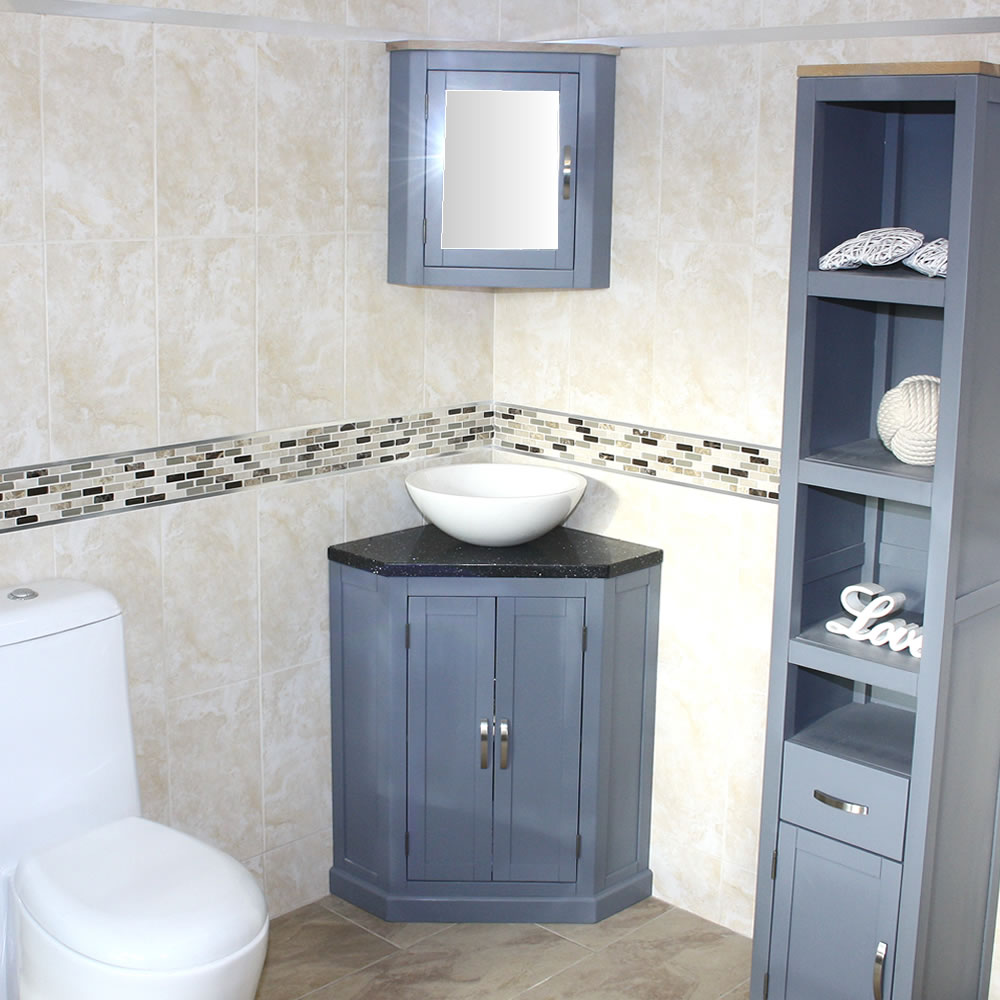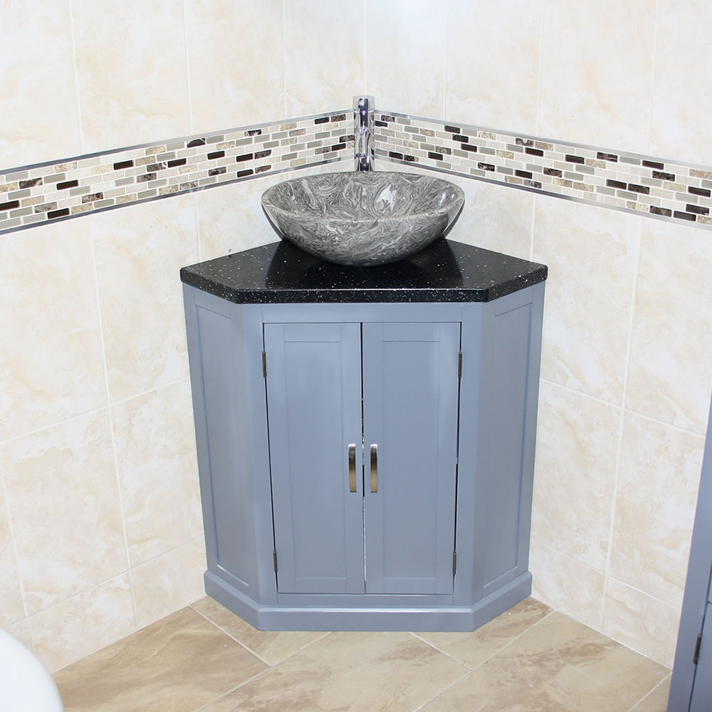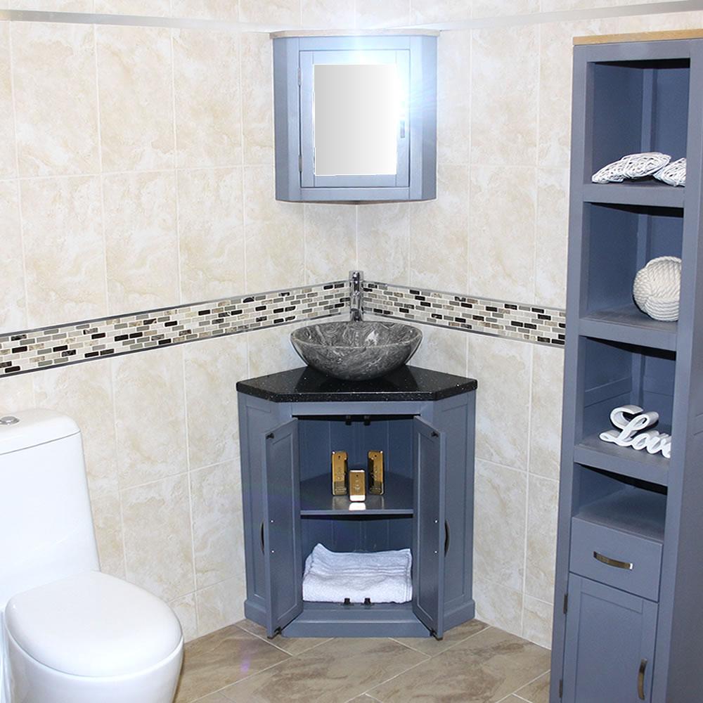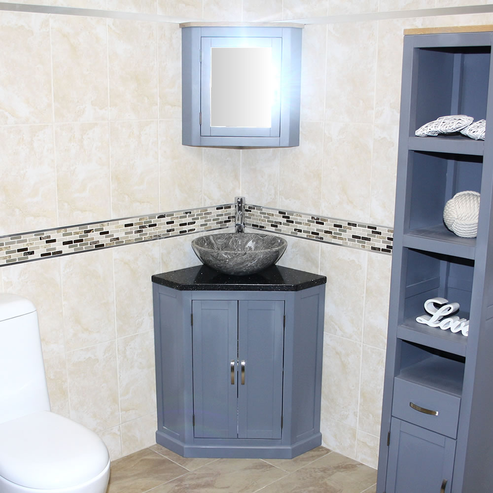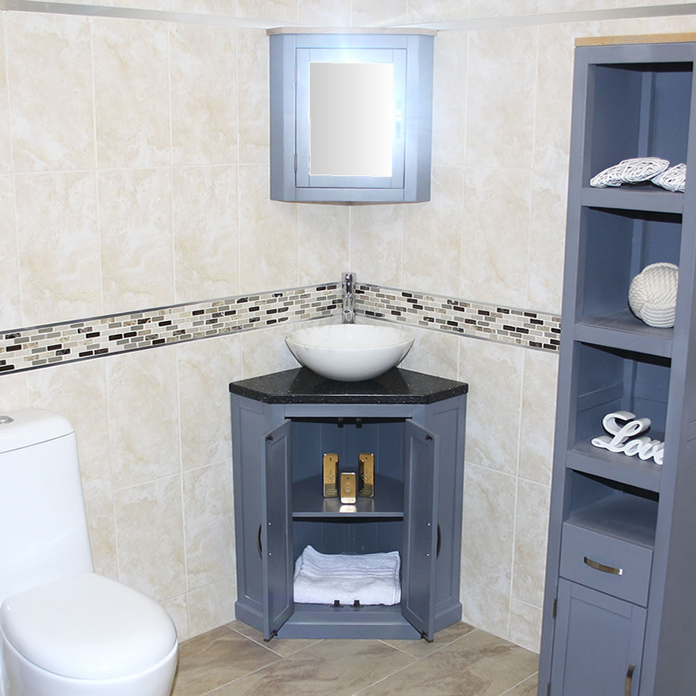 - Grey painted vanity unit.