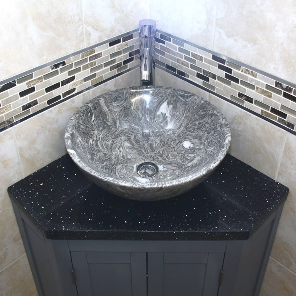 - A stunning pre drilled sparkling black quartz top.