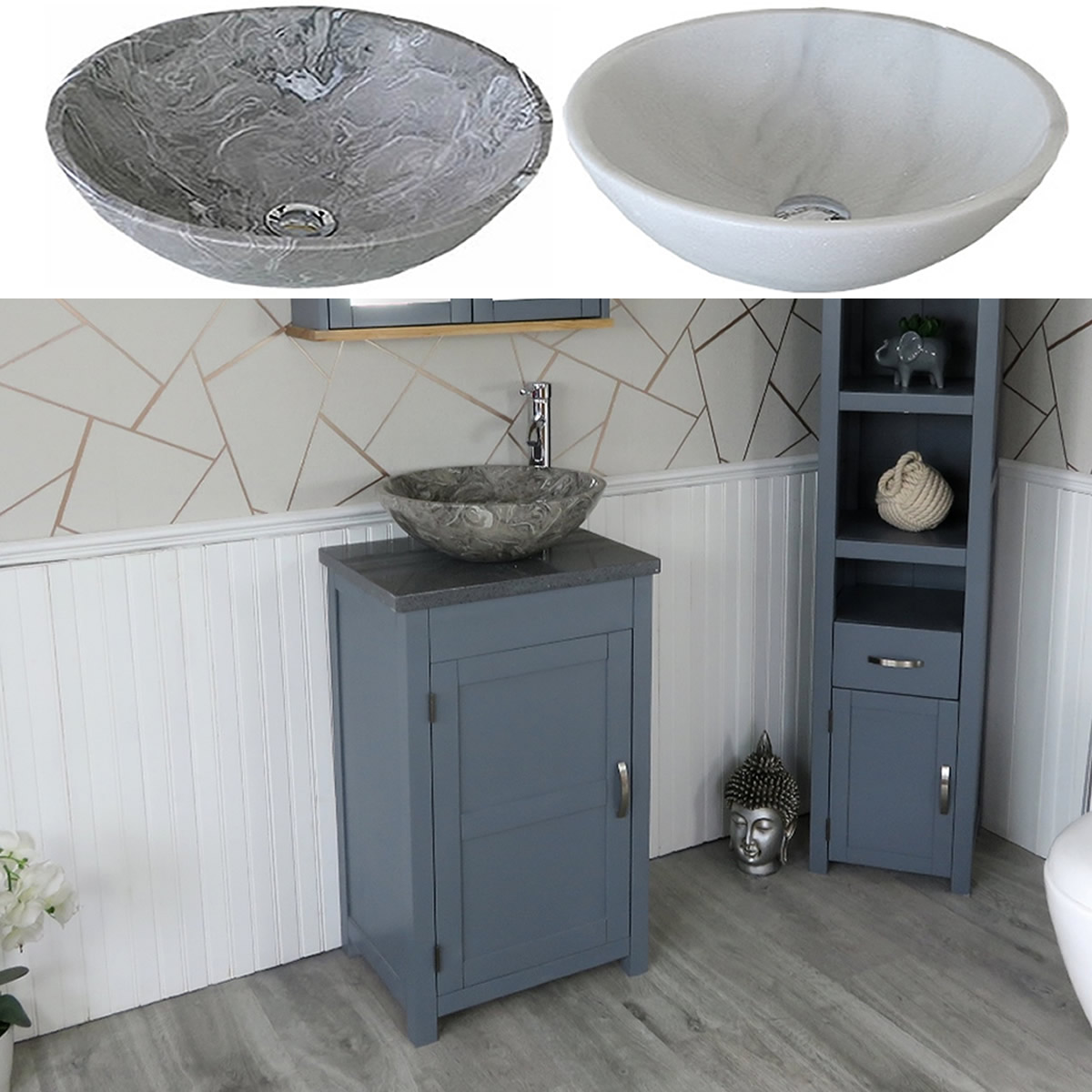- A beautiful heavy marble bowl of choice, see the dimensions of each basin below:
