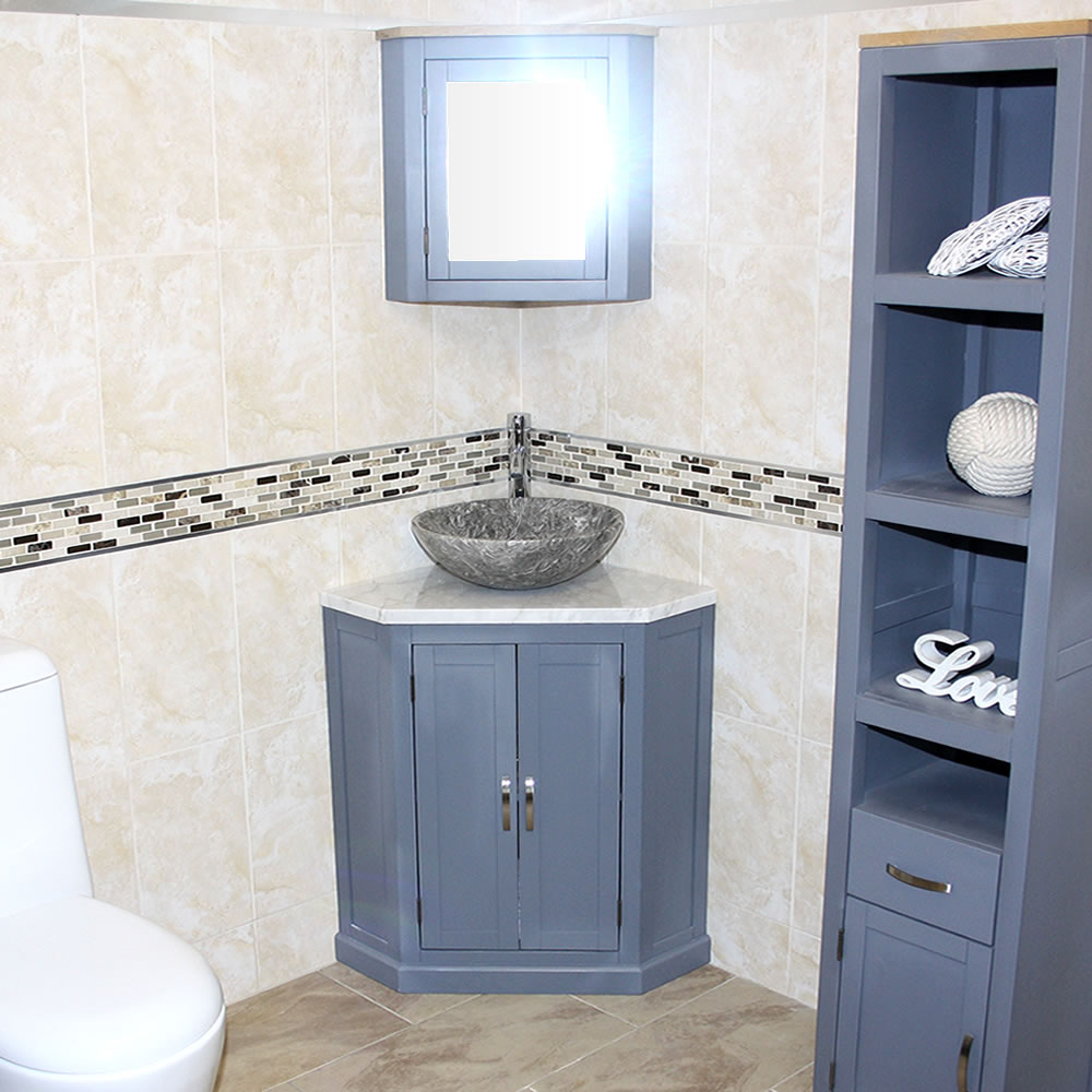 - Grey painted vanity unit.