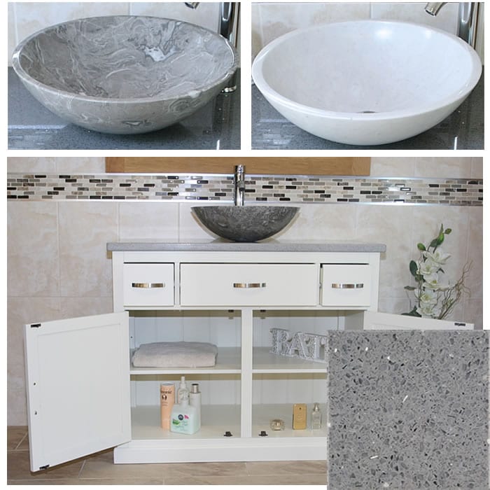- A stunning sparkling pre drilled starlight grey quartz top.