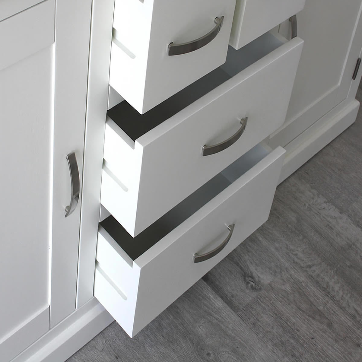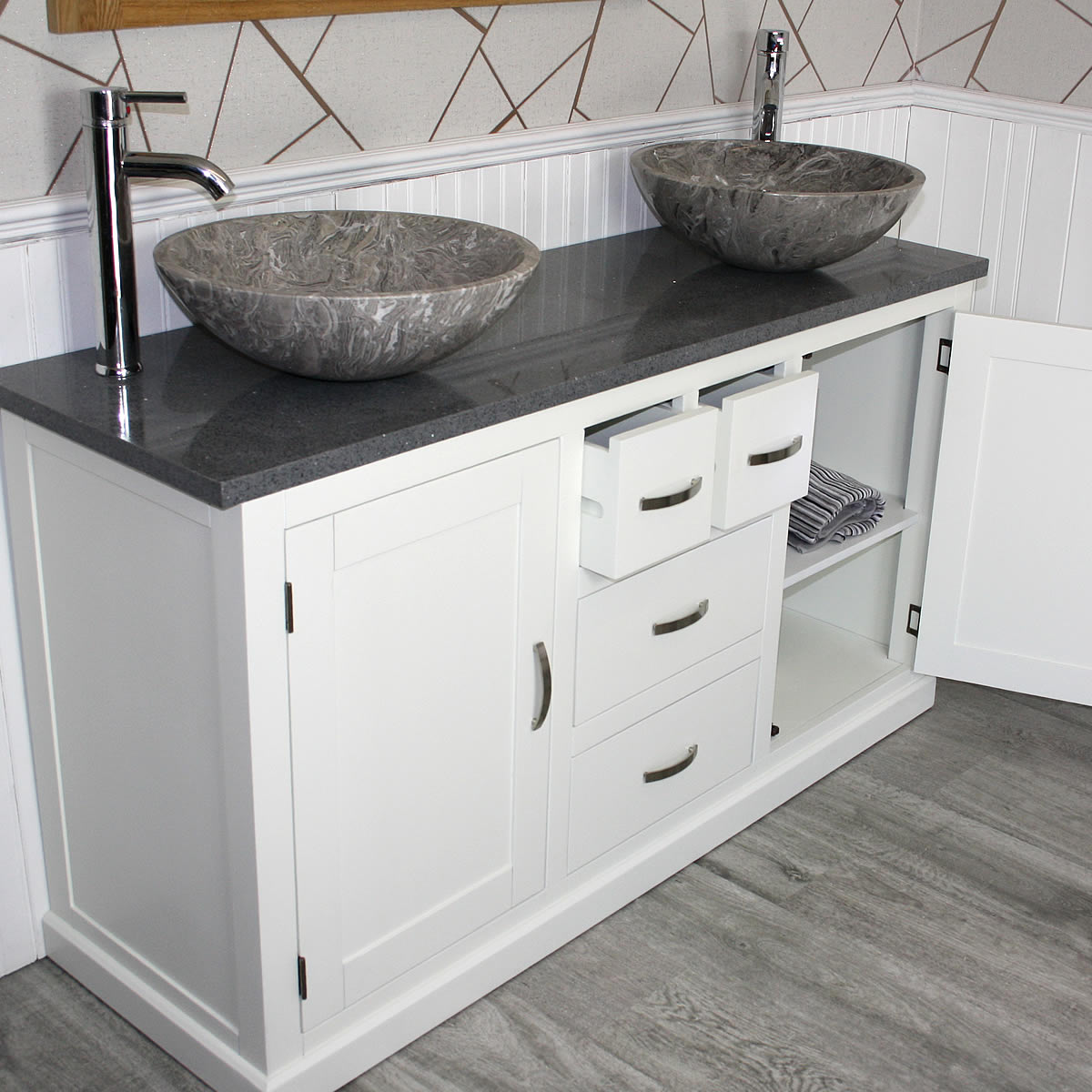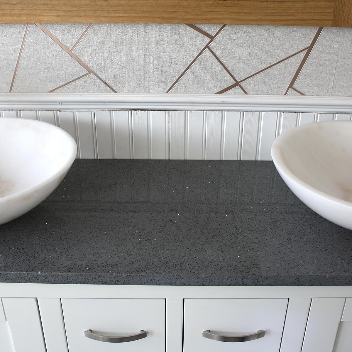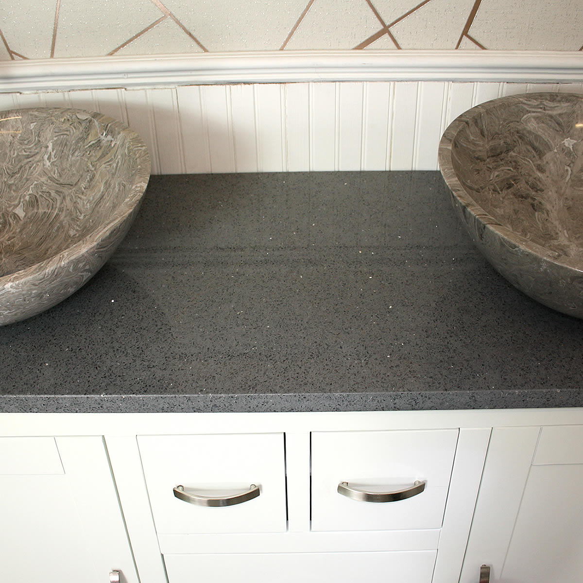 - One stunning double pre-drilled sparkling grey quartz work top.