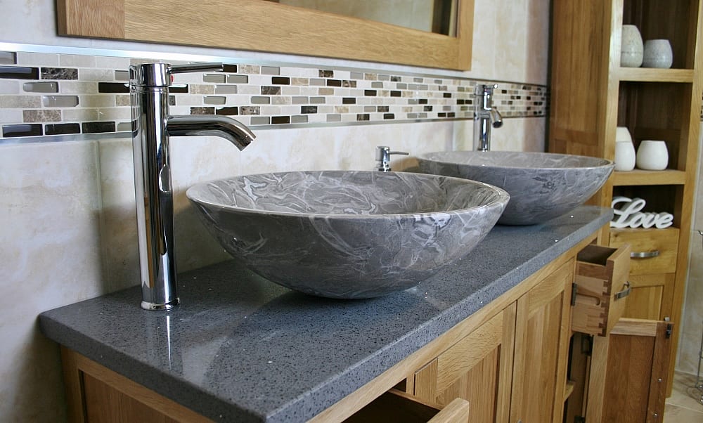 • One stunning double pre-drilled sparkling grey quartz work top.