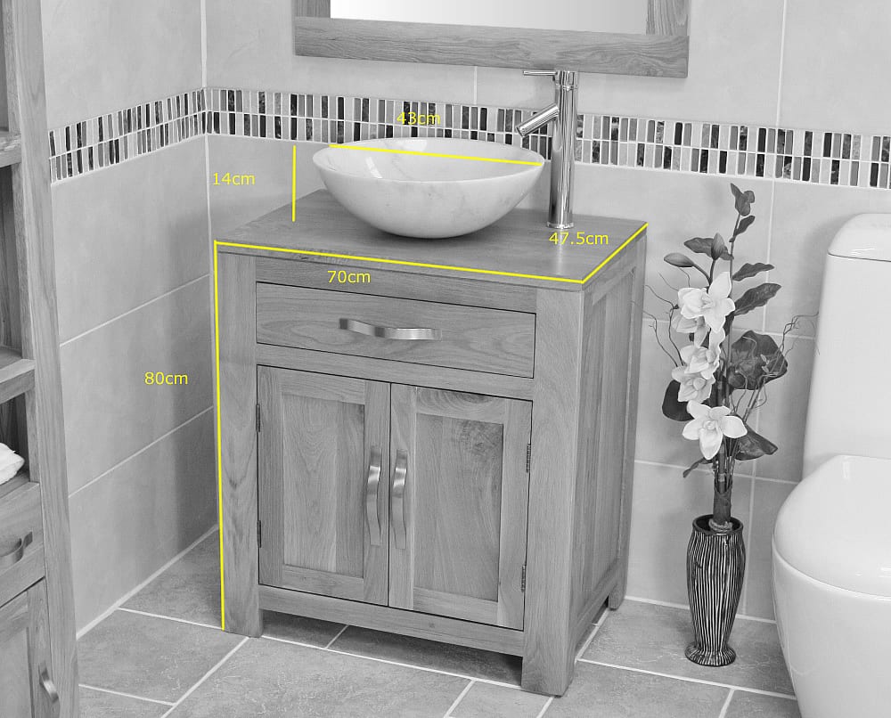 - The overall dimensions of the bathroom cabinet without the bowl are: H80cm x D47.5cm x W70cm.
