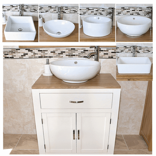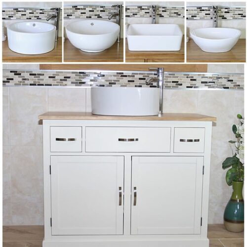 Painted solid oak topped vanity units available with a wide choice of basins from the simple beauty of ceramic & glass to the stunning nature of natural stone in a choice of colours.