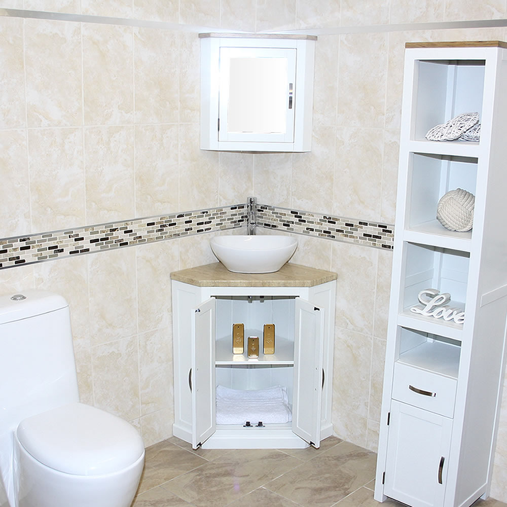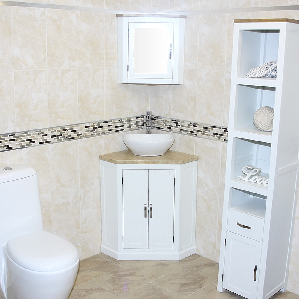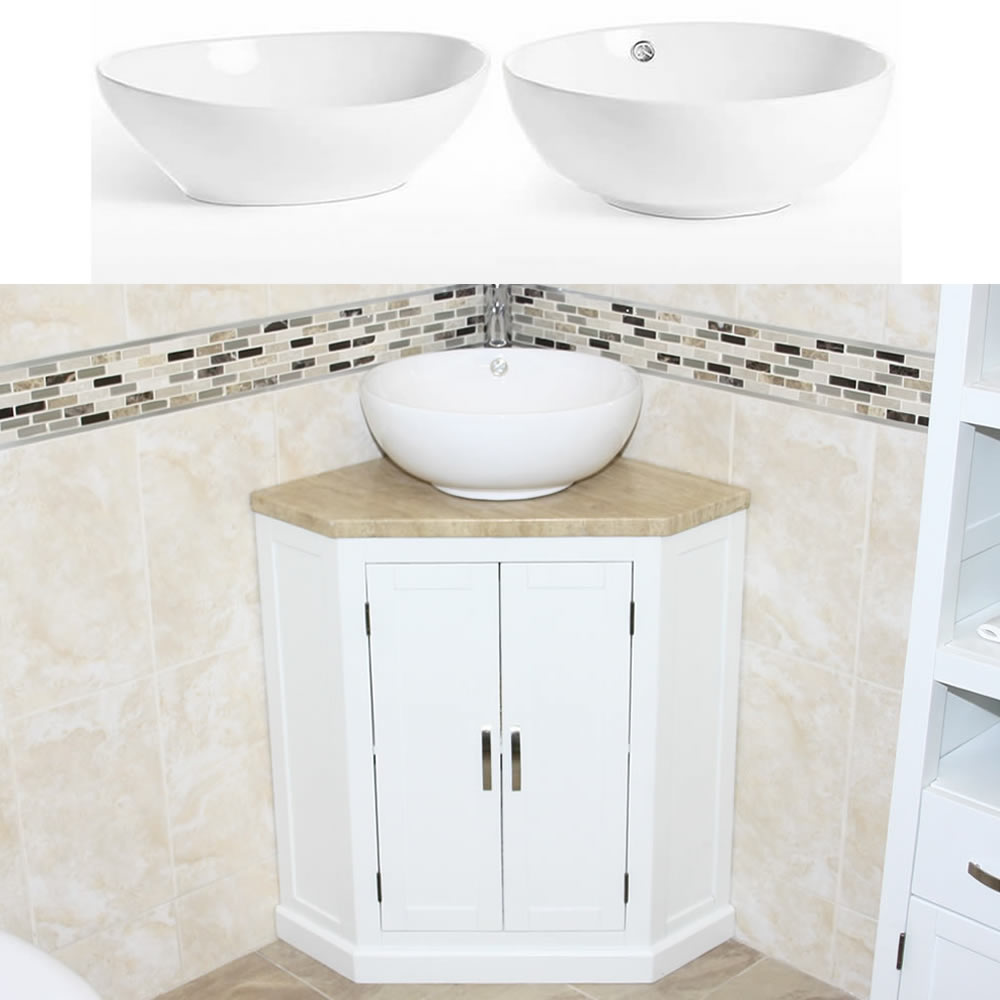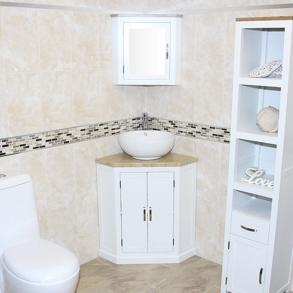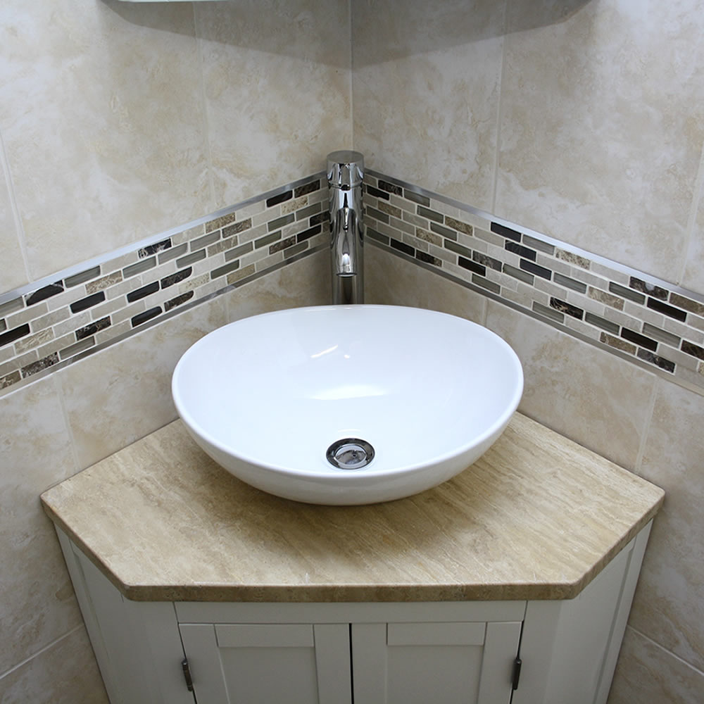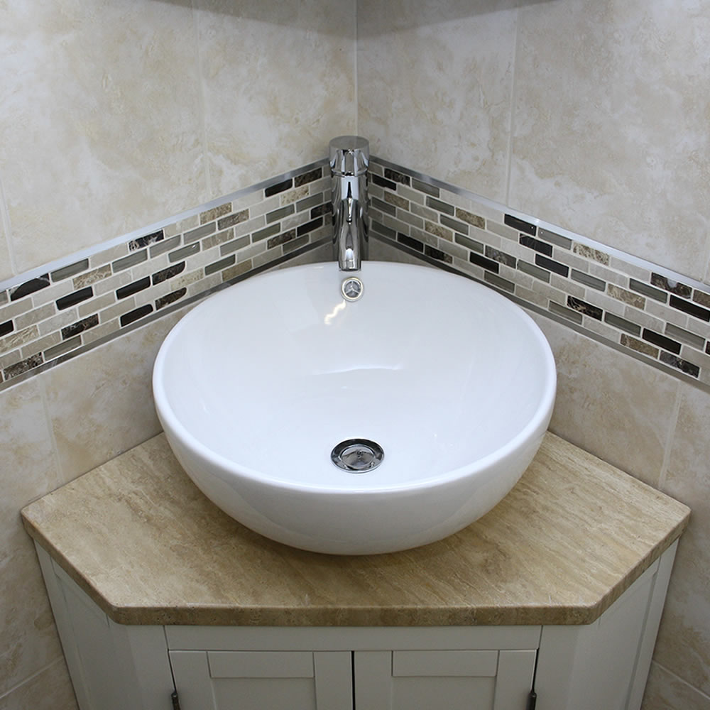 This corner vanity unit is stylishly completed with an elegant Travertine stone worktop, and a selection of quality ceramic basins to choose between. Select the shape that suits you best, which will come with a chromed pop-up plug & optional matching chromed mixer tap. If you instead would prefer a painted vanity unit with a stone top then you can find our selection of painted units here.