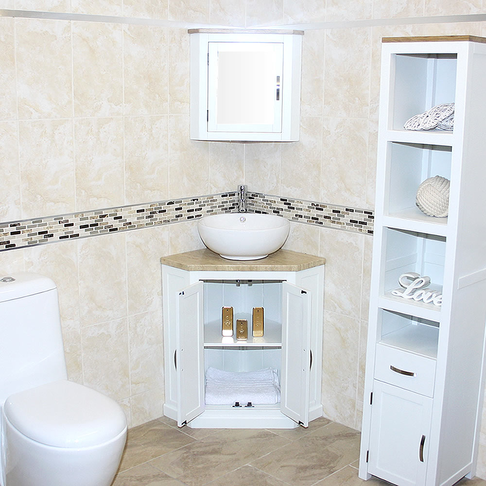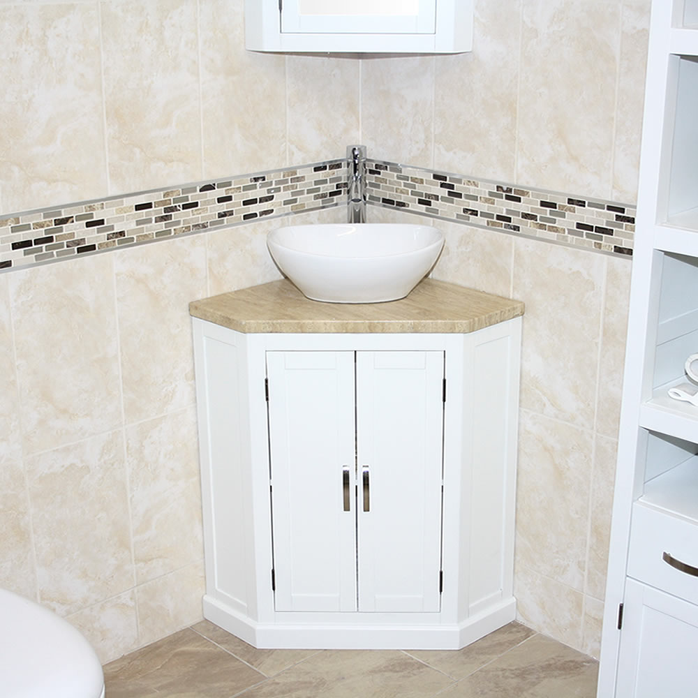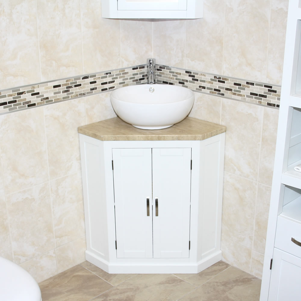 Off white painted corner vanity unit perfect for small bathroom spaces, or cloakrooms.
