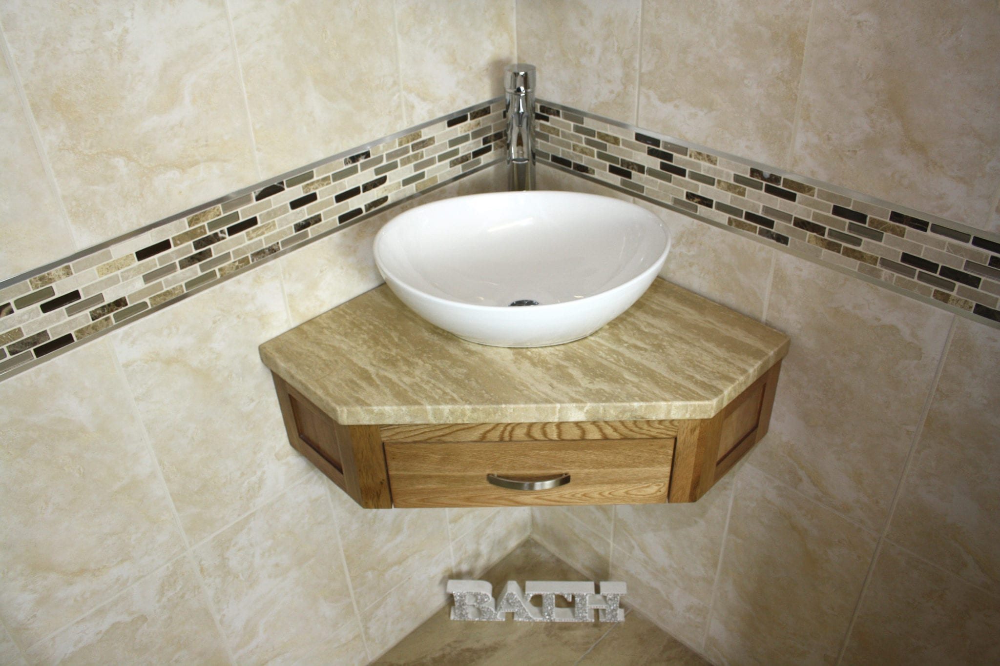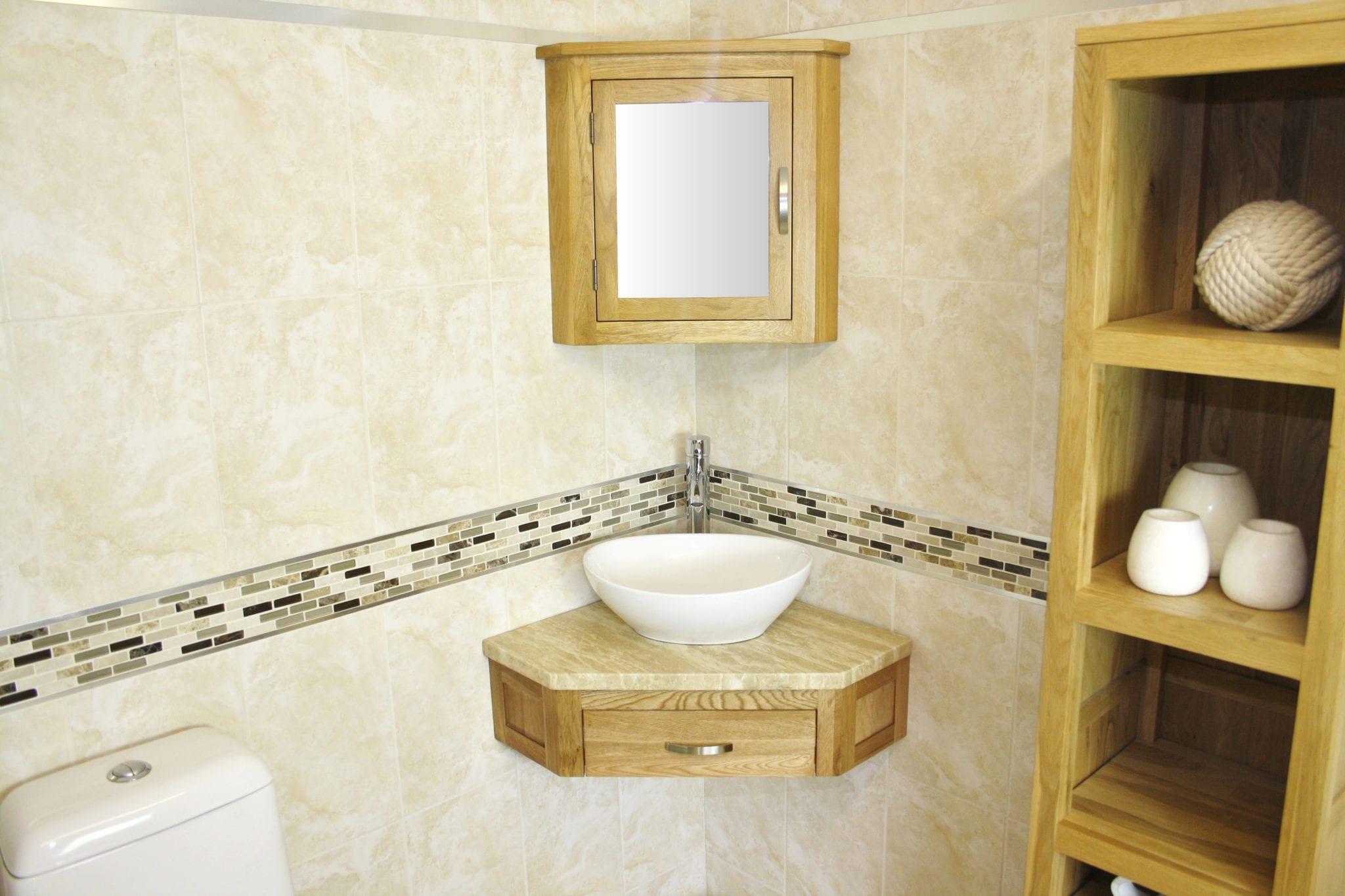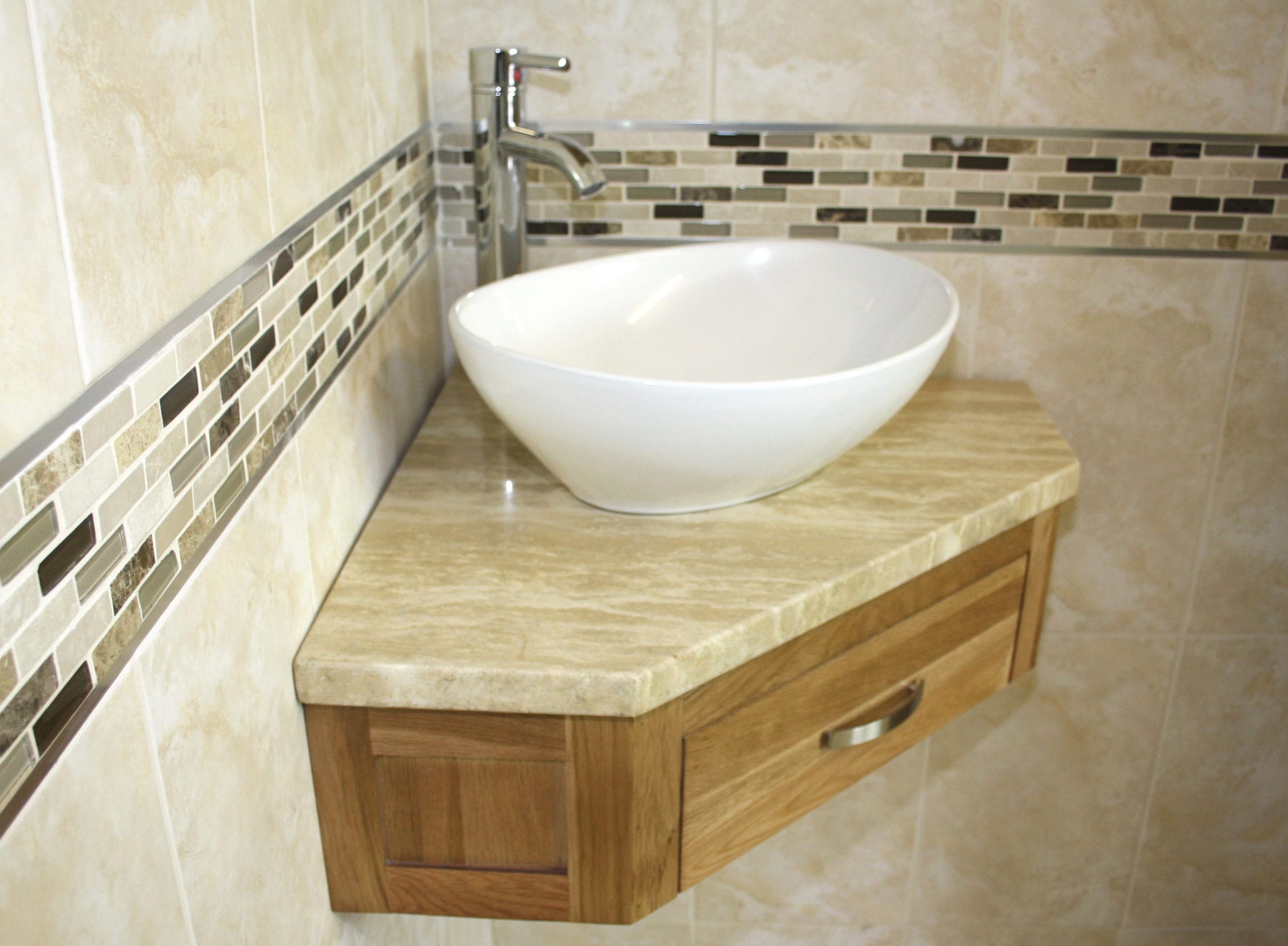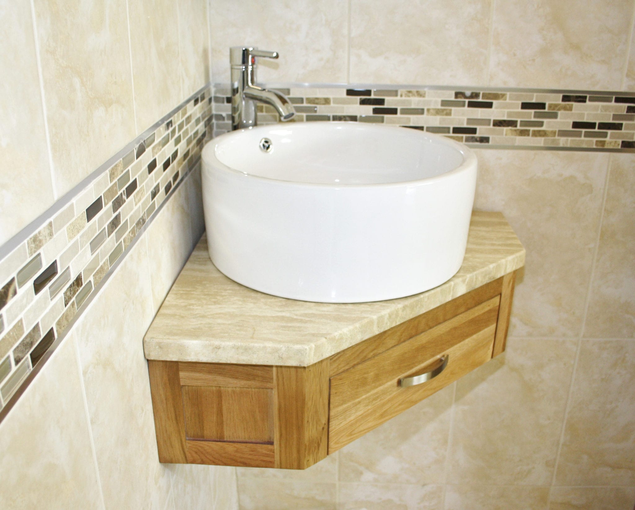 Wall Hung Corner Oak Vanity & Basin Unit with Travertine Top