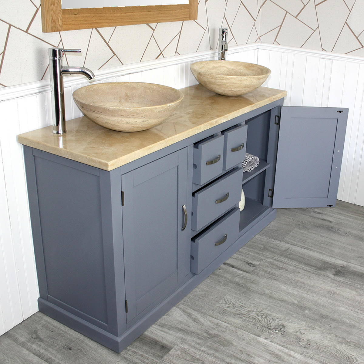 - Two round curved travertine bowls, see the dimensions of basin below: