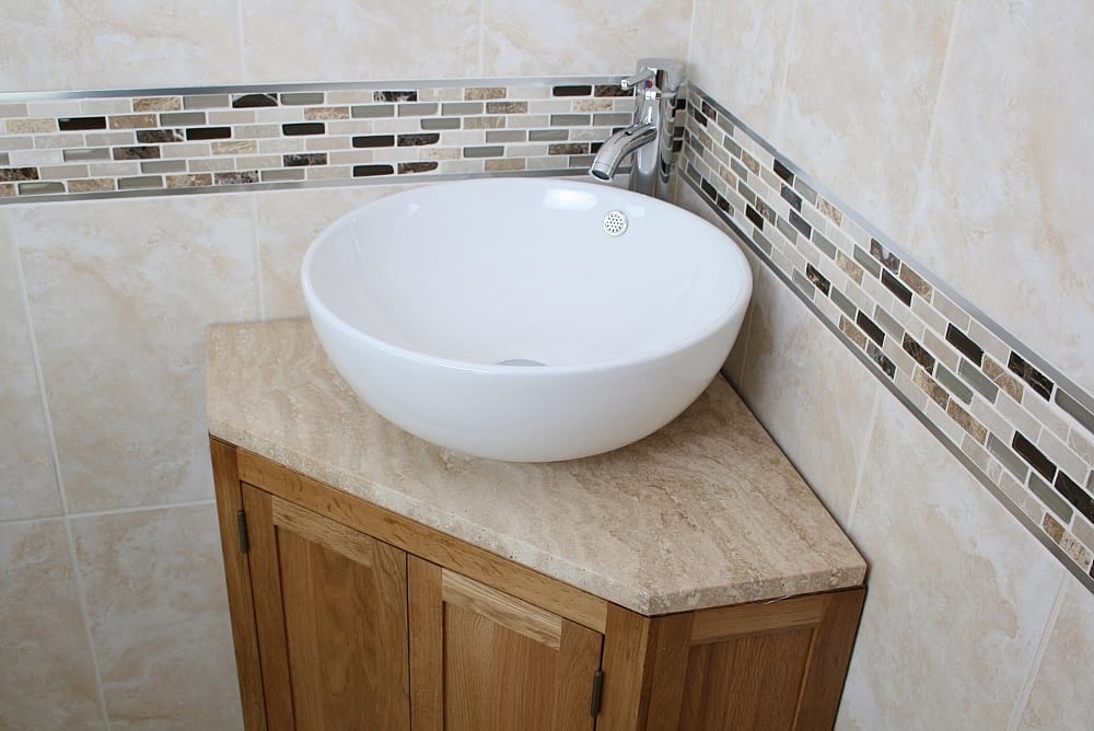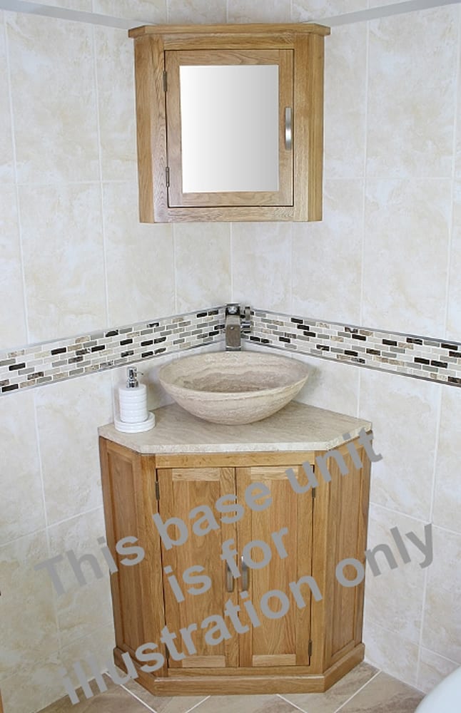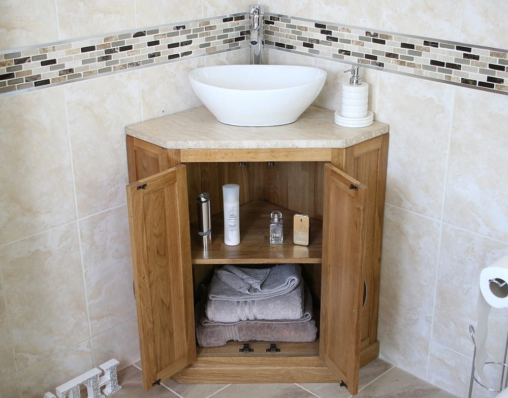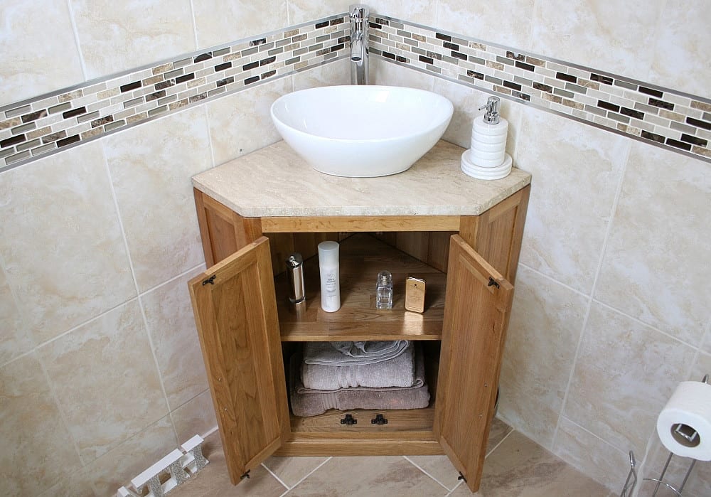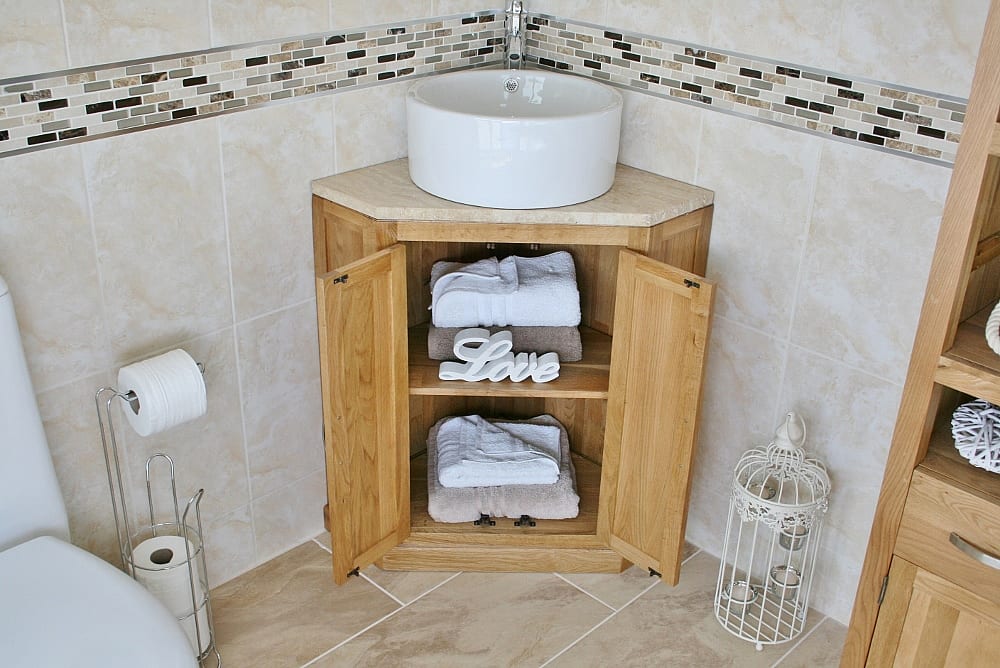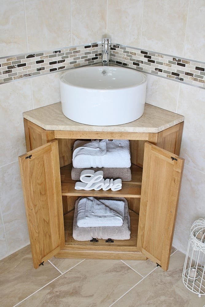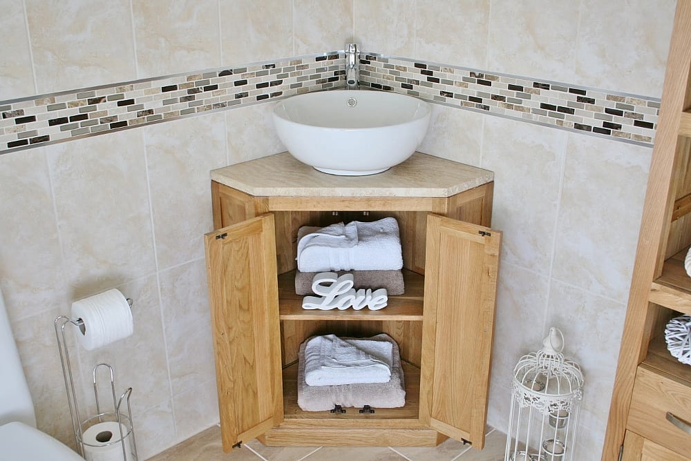 Oak corner vanity unit perfect for small bathroom spaces, or cloakrooms.