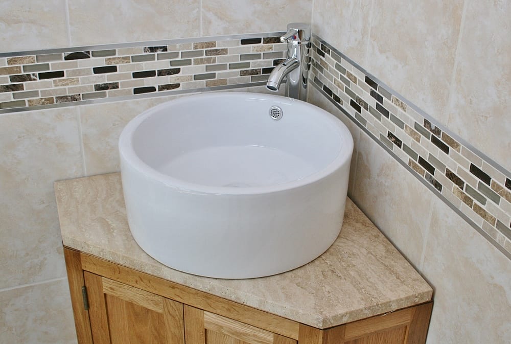 This corner vanity unit is stylishly completed with an elegant Travertine stone worktop, and a selection of quality ceramic basins to choose between. Select the shape that suits you best, which will come with a chromed pop-up plug & optional matching chromed mixer tap. If you instead would prefer a painted vanity unit with a stone top then you can find our selection of painted units here.