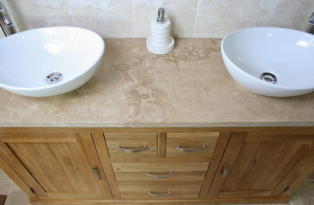 - One stunning double pre-drilled travertine work top.