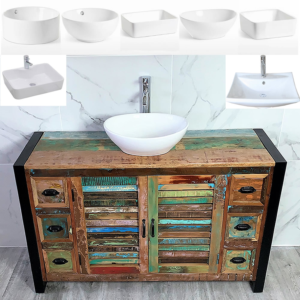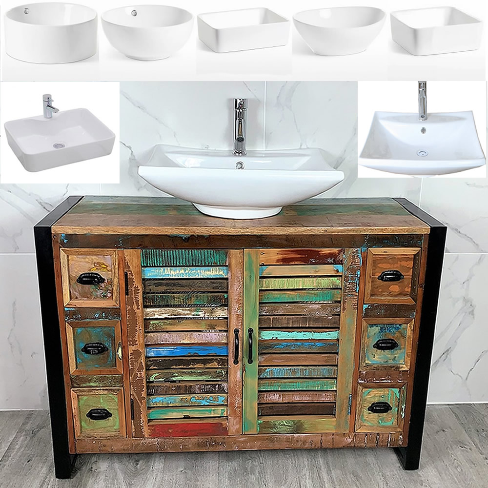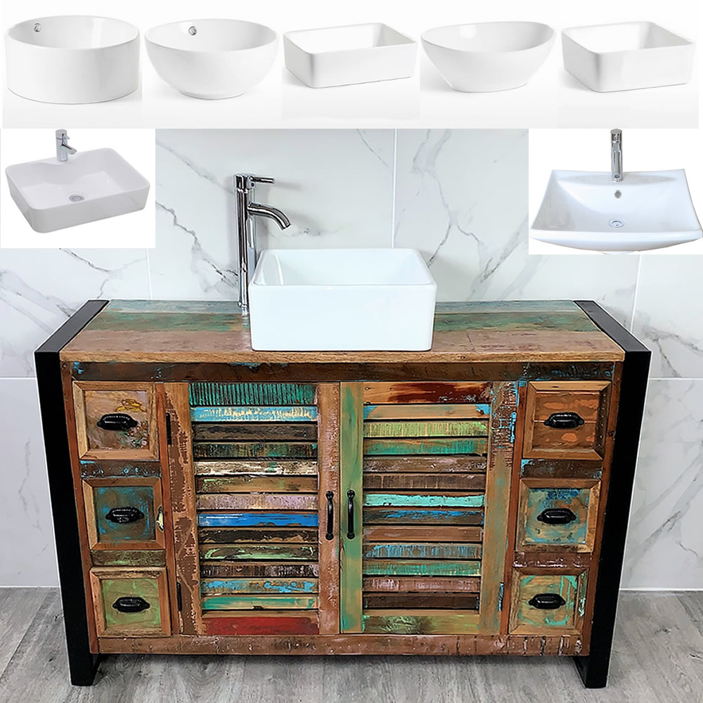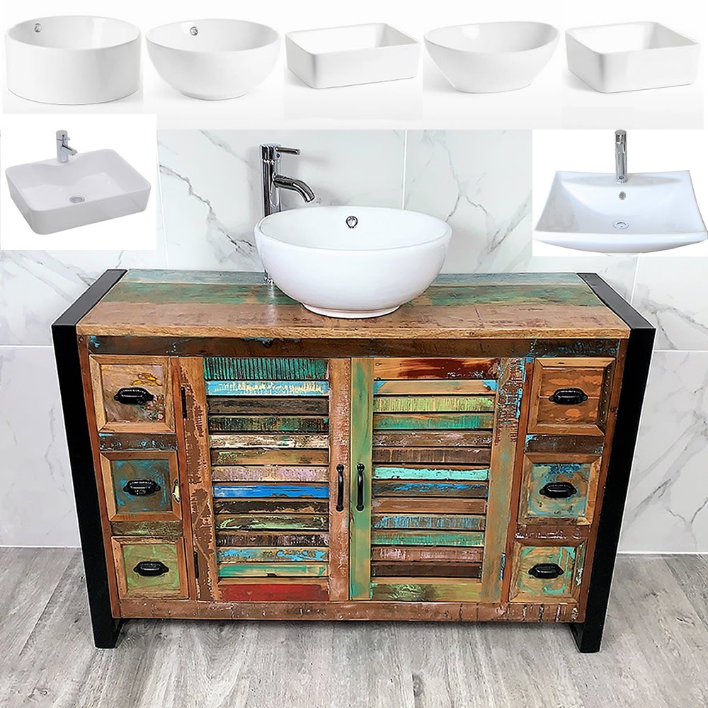 This Reclaimed Wood Bathroom Vanity Unit 6 Drawer 2 Door & Ceramic Basin is perfect to give an urban chic feel to your bathroom. Comprising of six drawers, two doors and a ceramic basin, The ceramic basin is durable and easy to clean, and comes with a mixer tap and plug and requires no assembly. Made by hand with reclaimed wood aged over decades, this solid washstand would make a wonderful addition to any modern yet rustic styled bathroom.