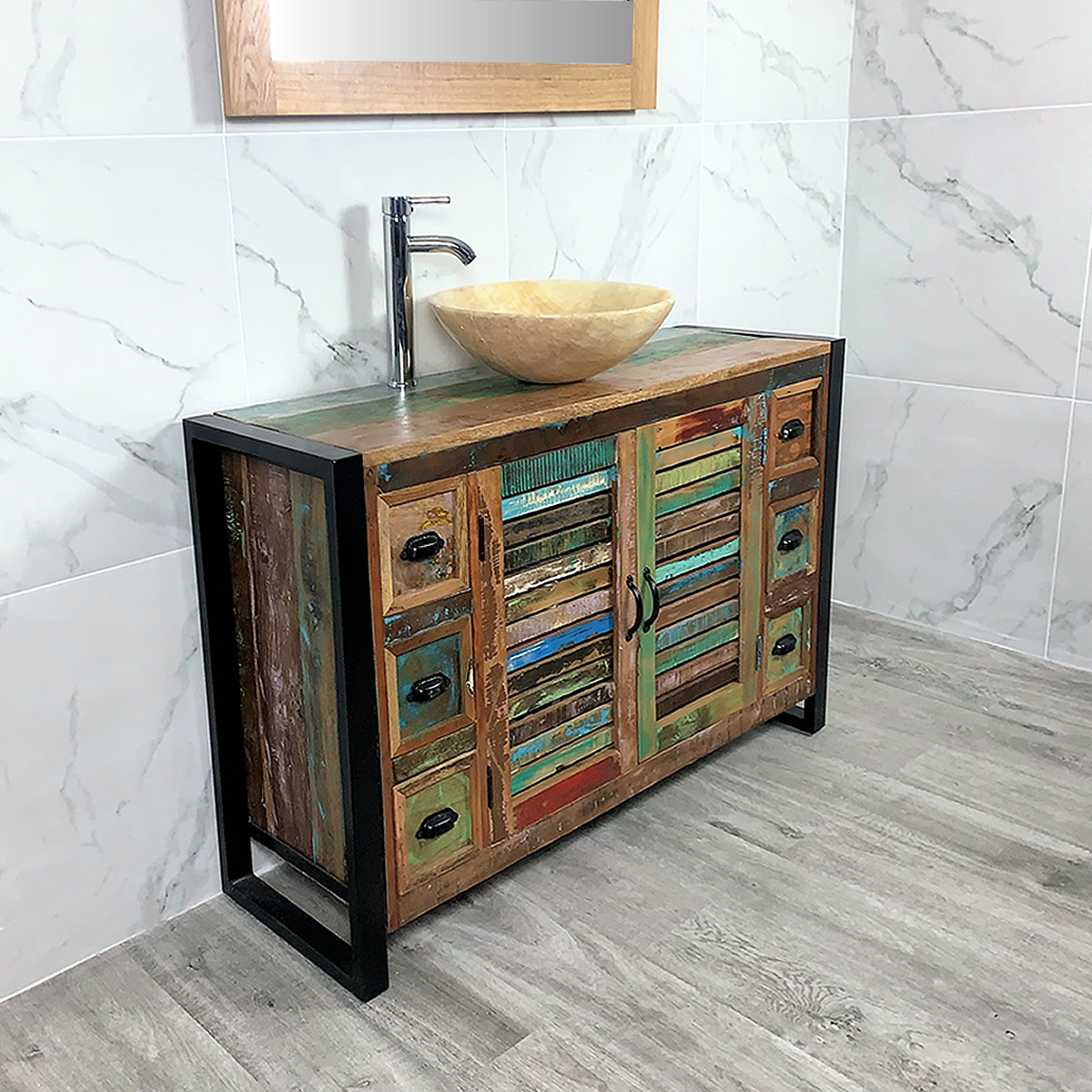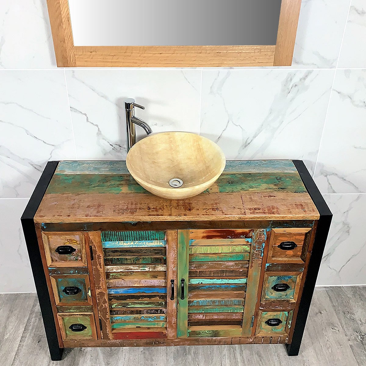 Urban chic is the perfect description for this gorgeous bathroom Vanity. Handmade from reclaimed wood, you will be the talk of your town when they see this stunning Vanity in person. This unit has three drawers on either side and two doors making it easy to store all your products and accessories in place with ease. The Onyx Basin is perfect for bathing and washing up before bed, with a sleek mixer tap to finish off the look beautifully.